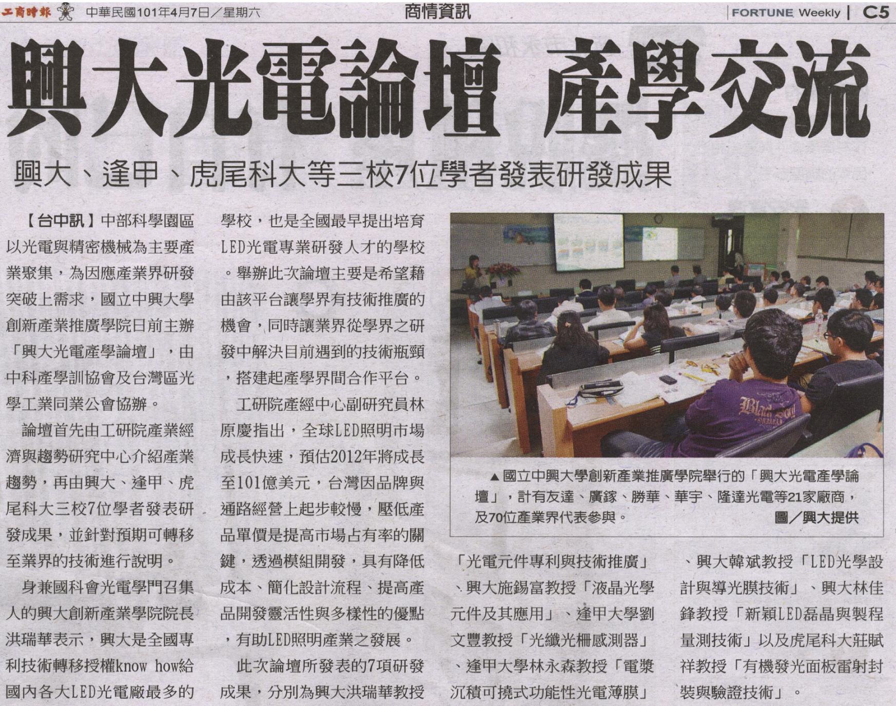 論壇首先由工研院產業經濟與趨勢研究中心介紹產業趨勢,再由興大、逢甲、虎尾科大三校7位學者發表研發成果,並針對預期可轉移至業界的技術進行說明。