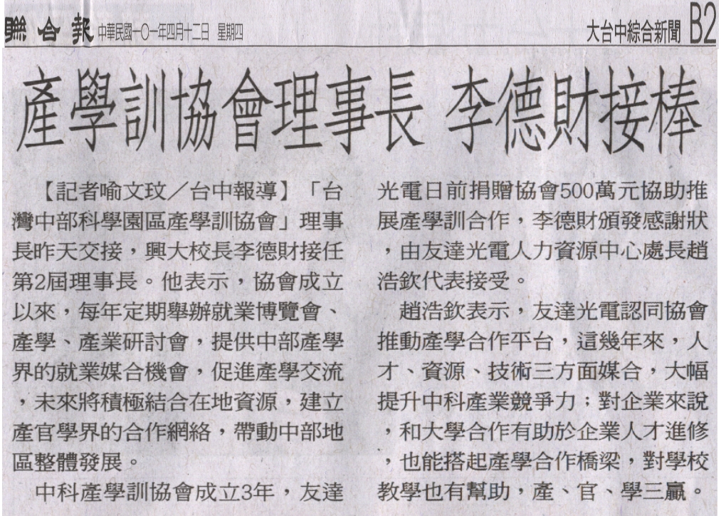 「台灣中部科學園區產學訓協會」理事長昨天交接,興大校長李德財接任第2屆理事長。他表示,協會成立以來,每年定期舉辦就業博覽會、產學、產業研討會,提供中部產學界的就業媒合機會,促進產學交流,未來將積極結合在地資源,建立產官學界的合作網絡,帶動中部地區整體發展。