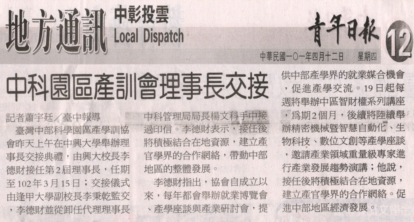 臺灣中部科學園區產學訓協會昨天上午在中興大學舉辦理事長交接典禮,由興大校長李德財接任第2屆理事長,任期至102年3月15日;交接儀式由逢甲大學副校長李秉乾監交,李德財並從卸任代理理事長中科管理局局長楊文科手中接過印信。李德財表示,接任後將積極結合在地資源,建立產官學界的合作網絡,帶動中部地區的整體發展。