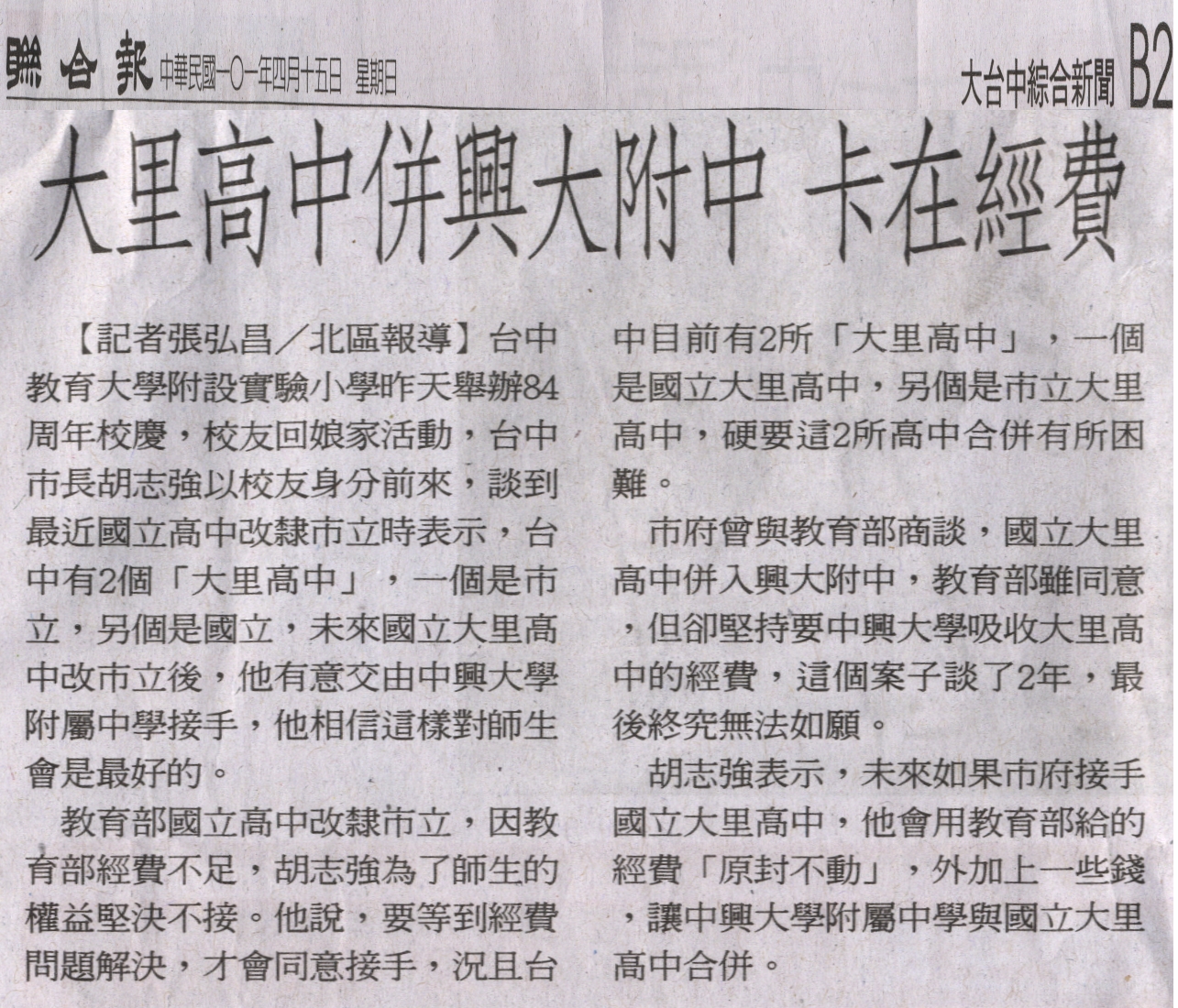 台中教育大學附設實驗小學昨天舉辦84周年校慶,校友回娘家活動,台中市長胡志強以校友身分前來,談到最近國立高中改隸市立時表示,台中有2個「大里高中」,一個是市立,另個是國立,未來國立大里高中改市立後,他有意交由中興大學附屬中學接手,他相信這樣對師生會是最好的。