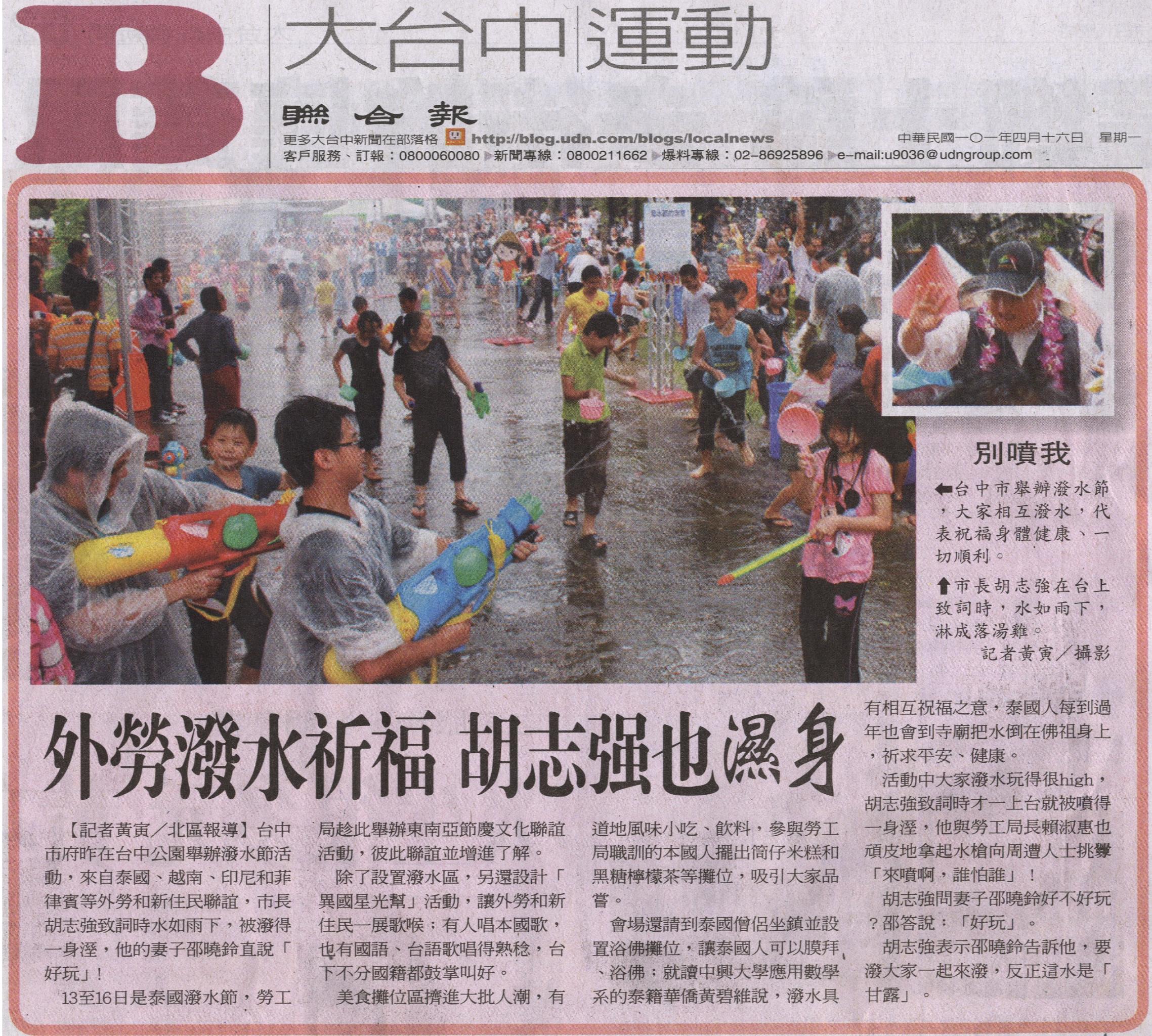 活動中大家潑水玩得很high,胡志強致詞時才一上台就被噴得一身溼,他與勞工局長賴淑惠也頑皮地拿起水槍向周遭人士挑釁「來噴啊,誰怕誰」!
