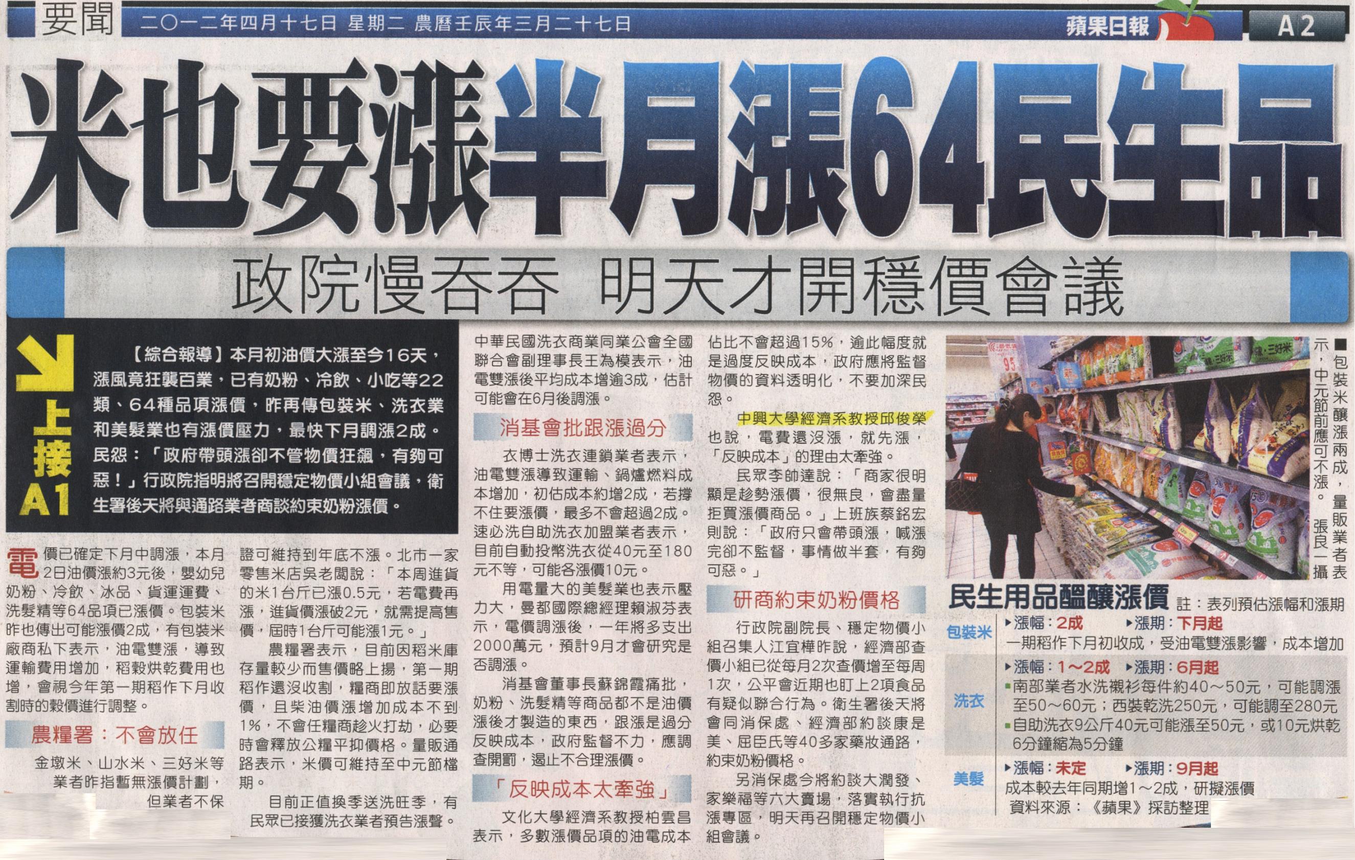 電價已確定下月中調漲,本月2日油價漲約3元後,嬰幼兒奶粉、冷飲、冰品、貨運運費、洗髮精等64品項已漲價。包裝米昨也傳出可能漲價2成,有包裝米廠商私下表示,油電雙漲,導致運輸費用增加,稻穀烘乾費用也增,會視今年第一期稻作下月收割時的穀價進行調整。