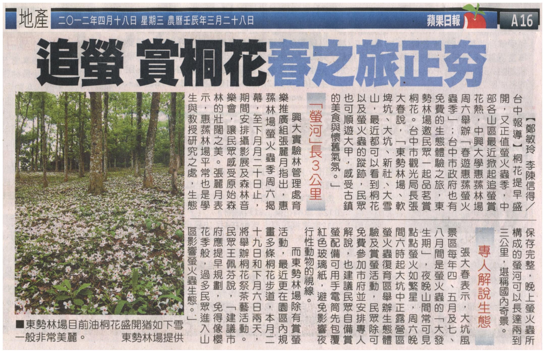 桐花提早盛開,又正值螢火蟲季,中部各山區最近掀起追螢賞花熱,中興大學惠蓀林場周六舉辦「春遊惠蓀螢火蟲季」;台中市政府也有免費的生態體驗之旅,東勢林場邀民眾一起品茗賞桐花。台中市觀光局長張大春說,「東勢林場、軟埤坑、大坑、新社、大雪山,最近都可以看到桐花以及螢火蟲的蹤跡,民眾也可順遊大甲,感受古鎮的美食與懷舊氣氛。」