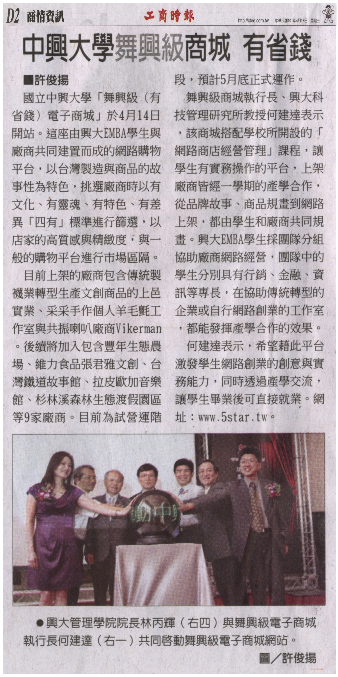 國立中興大學「舞興級(有省錢)電子商城」於4月14日開站。這座由興大EMBA學生與廠商共同建置而成的網路購物平台,以台灣製造與商品的故事性為特色,挑選廠商時以有文化、有靈魂、有特色、有差異「四有」標準進行篩選,以店家的高質感與精緻度,與一般的購物平台進行市場區隔。