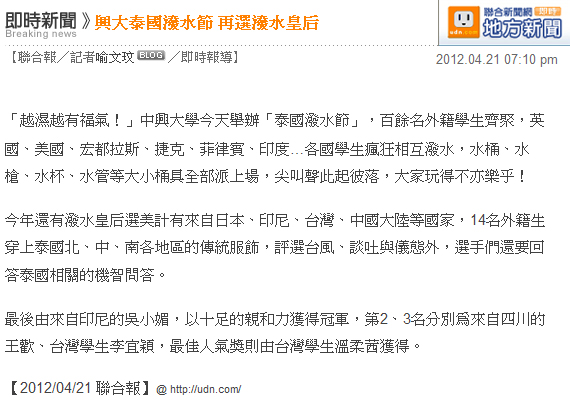 「越濕越有福氣!」中興大學今天舉辦「泰國潑水節」,百餘名外籍學生齊聚,英國、美國、宏都拉斯、捷克、菲律賓、印度…各國學生瘋狂相互潑水,水桶、水槍、水杯、水管等大小桶具全部派上場,尖叫聲此起彼落,大家玩得不亦樂乎!