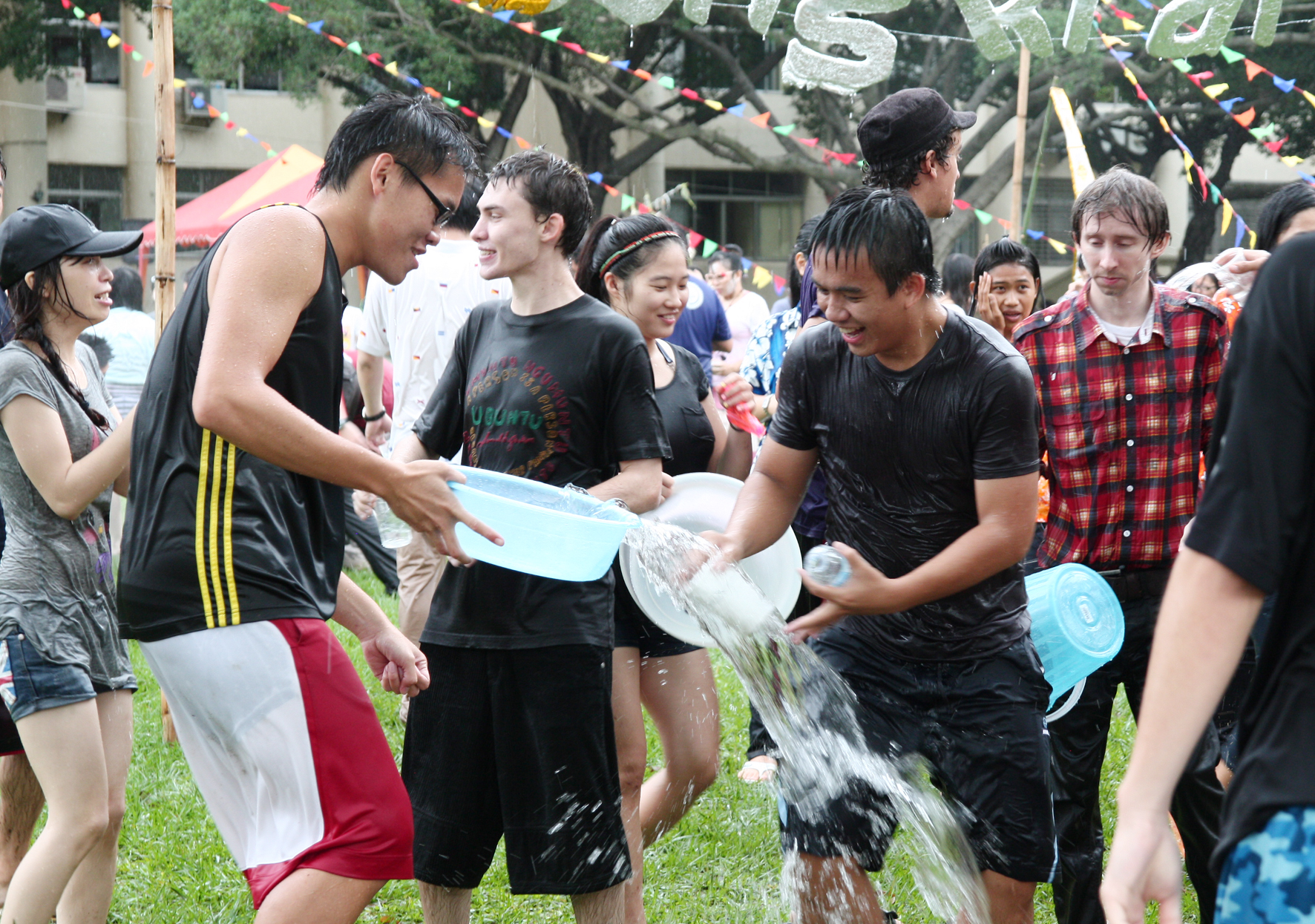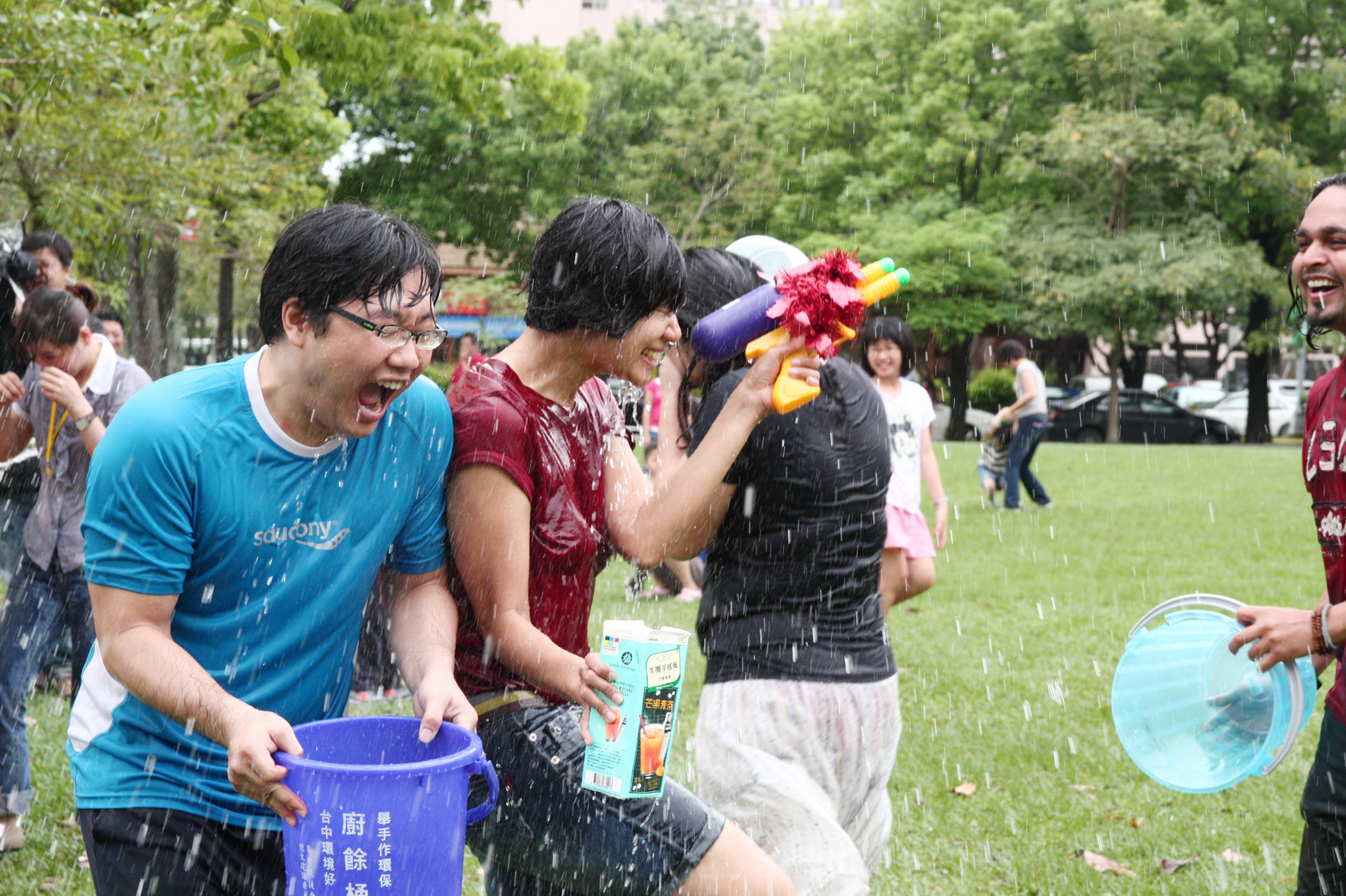 國立中興大學21日下午舉辦「泰國潑水節」活動,100多位學生齊聚興大行政大樓後方草坪,來自英國、美國、洪都拉斯、捷克、菲律賓、印度、印尼、台灣等各國的學生瘋狂相互潑水,水桶、水槍、水杯、垃圾桶、水管等大小桶具全部派上場,尖叫聲此起彼落,大家玩得不亦樂乎,泰國學生說:「越濕越福氣啦!」