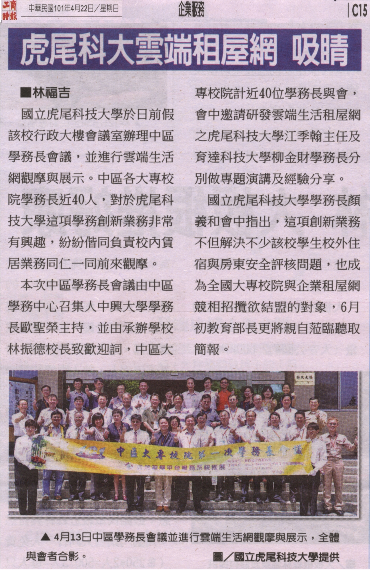 國立虎尾科技大學學務長顏義和會中指出,這項創新業務不但解決不少該校學生校外住宿與房東安全評核問題,也成為全國大專校院與企業租屋網競相招攬欲結盟的對象,6月初教育部長更將親自蒞臨聽取簡報。
