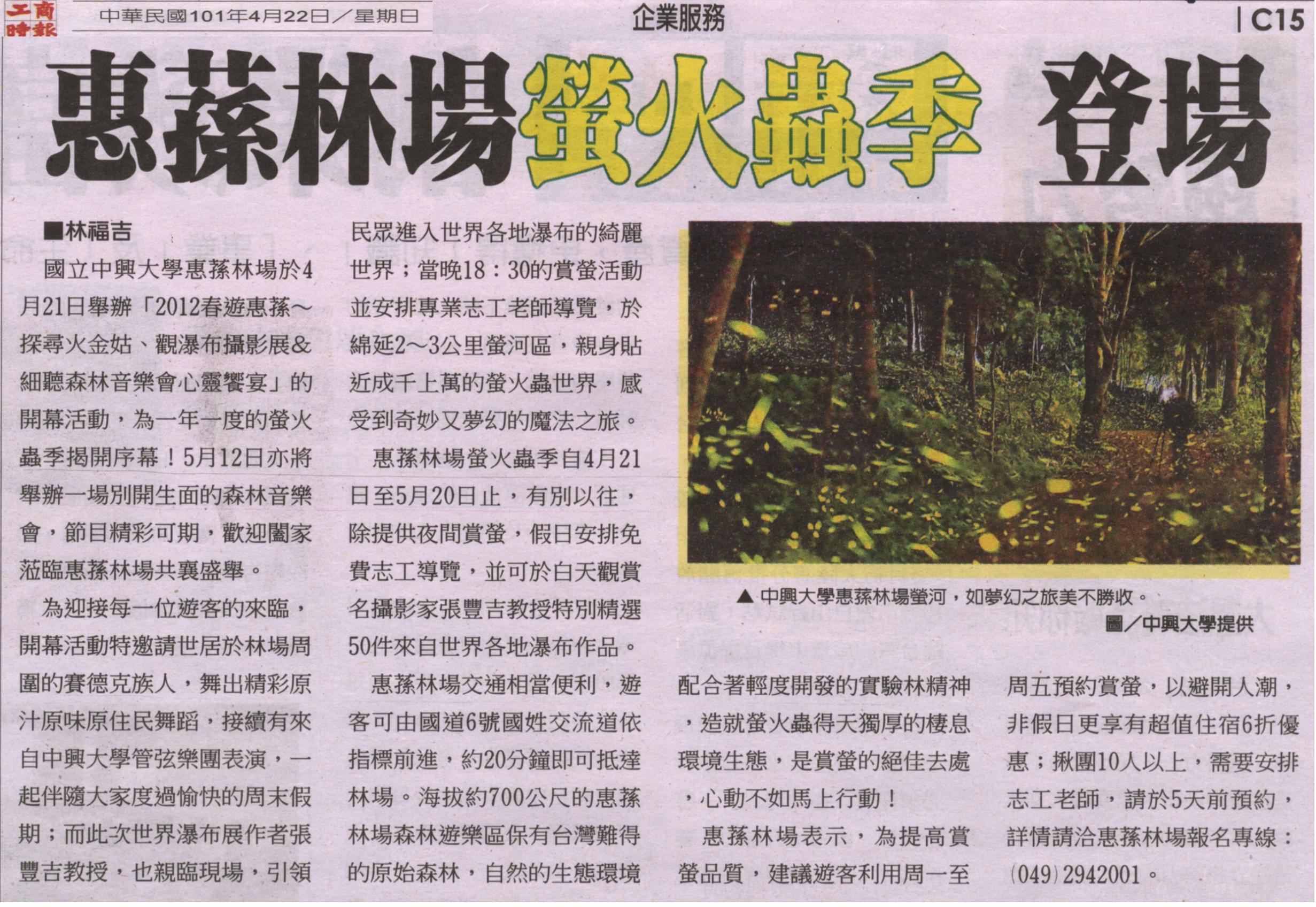 國立中興大學惠蓀林場於4月21日舉辦「2012春遊惠蓀~探尋火金姑、觀瀑布攝影展&細聽森林音樂會心靈饗宴」的開幕活動,為一年一度的螢火蟲季揭開序幕!5月12日亦將舉辦一場別開生面的森林音樂會,節目精彩可期,歡迎闔家蒞臨惠蓀林場共襄盛舉。