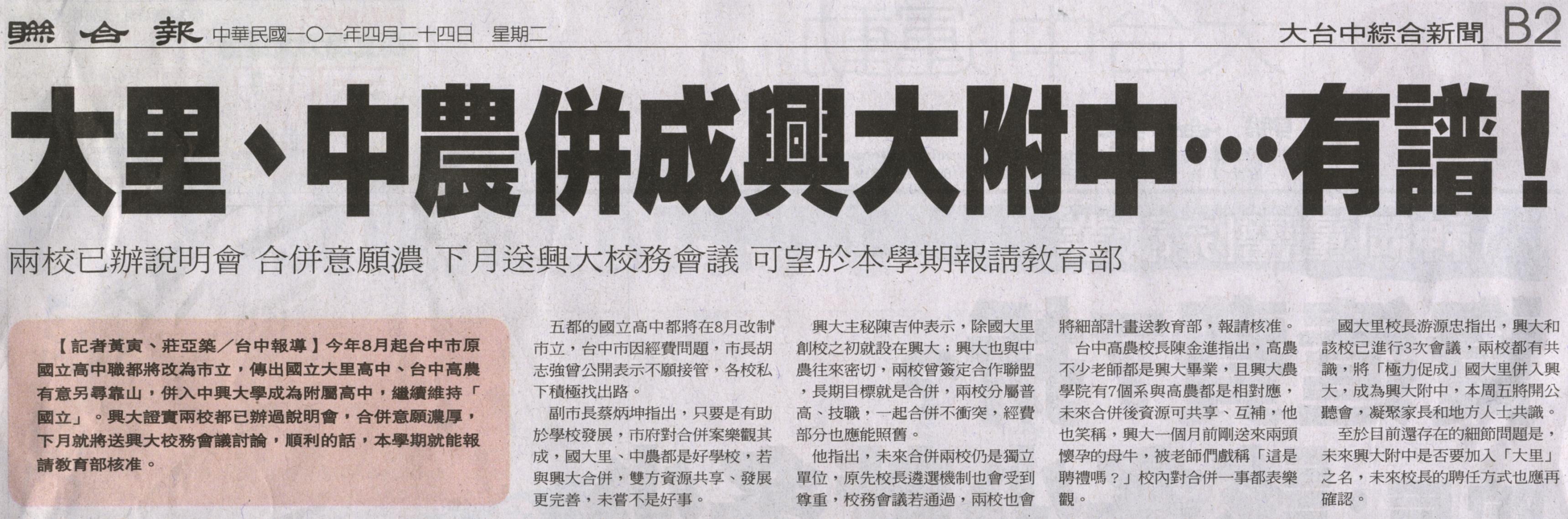 今年8月起台中市原國立高中職都將改為市立,傳出國立大里高中、台中高農有意另尋靠山,併入中興大學成為附屬高中,繼續維持「國立」。興大證實兩校都已辦過說明會,合併意願濃厚,下月就將送興大校務會議討論,順利的話,本學期就能報請教育部核准。