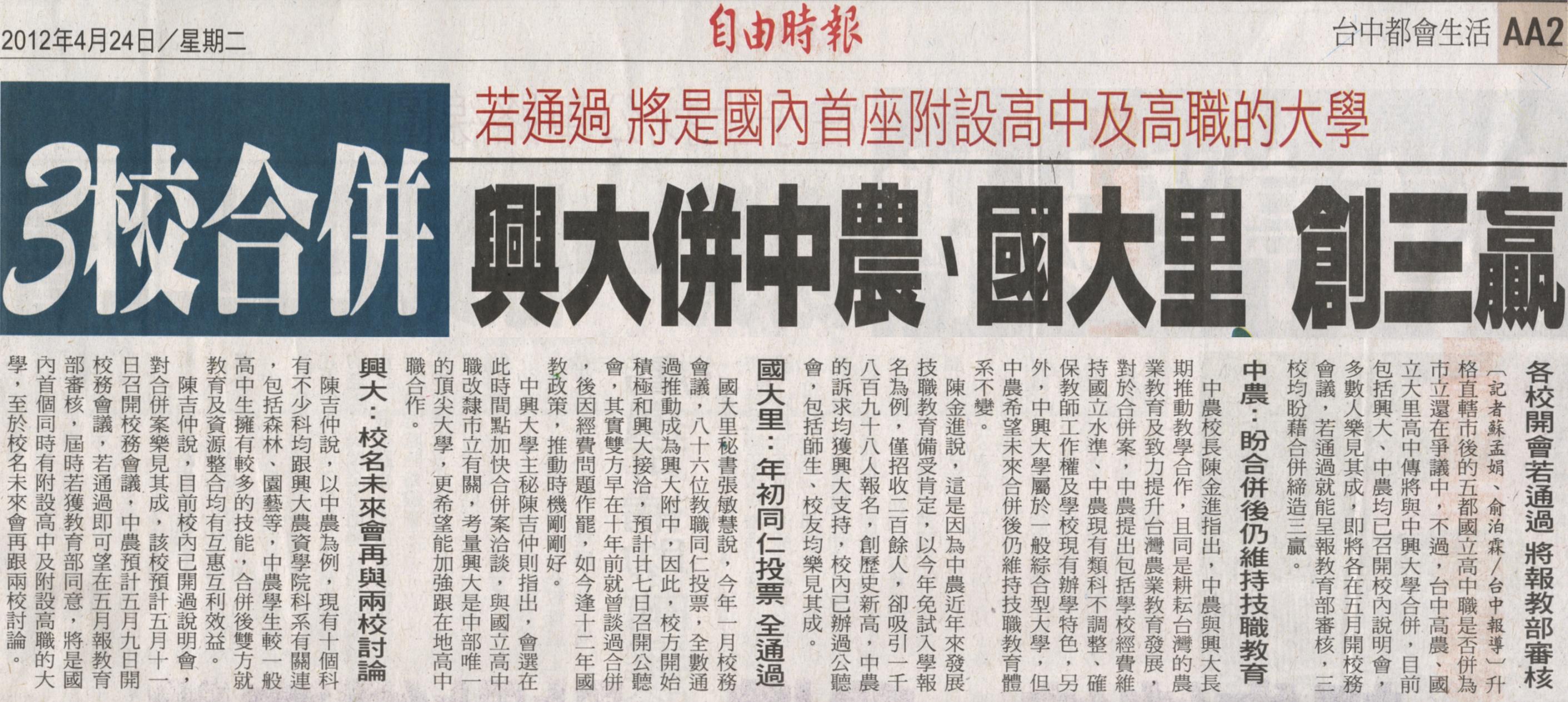 升格直轄市後的五都國立高中職是否併為市立還在爭議中,不過,台中高農、國立大里高中傳將與中興大學合併,目前包括興大、中農均已召開校內說明會,多數人樂見其成,即將各在五月開校務會議,若通過就能呈報教育部審核,三校均盼藉合併締造三贏。