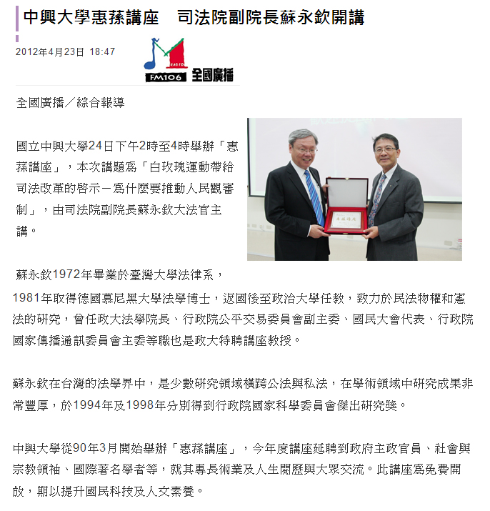 國立中興大學24日下午2時至4時舉辦「惠蓀講座」,本次講題為「白玫瑰運動帶給司法改革的啟示-為什麼要推動人民觀審制」,由司法院副院長蘇永欽大法官主講。