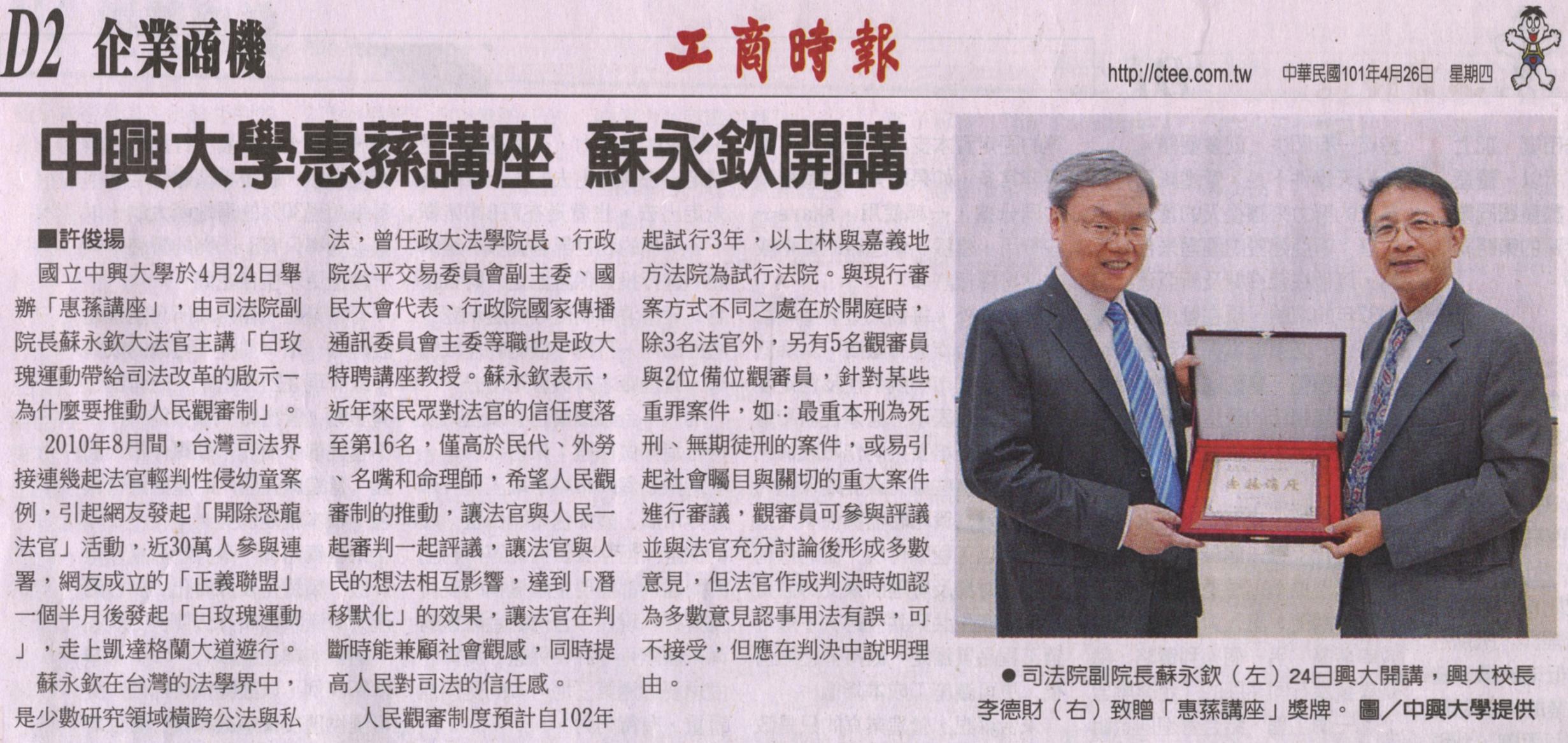 國立中興大學於4月24日舉辦「惠蓀講座」,由司法院副院長蘇永欽大法官主講「白玫瑰運動帶給司法改革的啟示-為什麼要推動人民觀審制」。