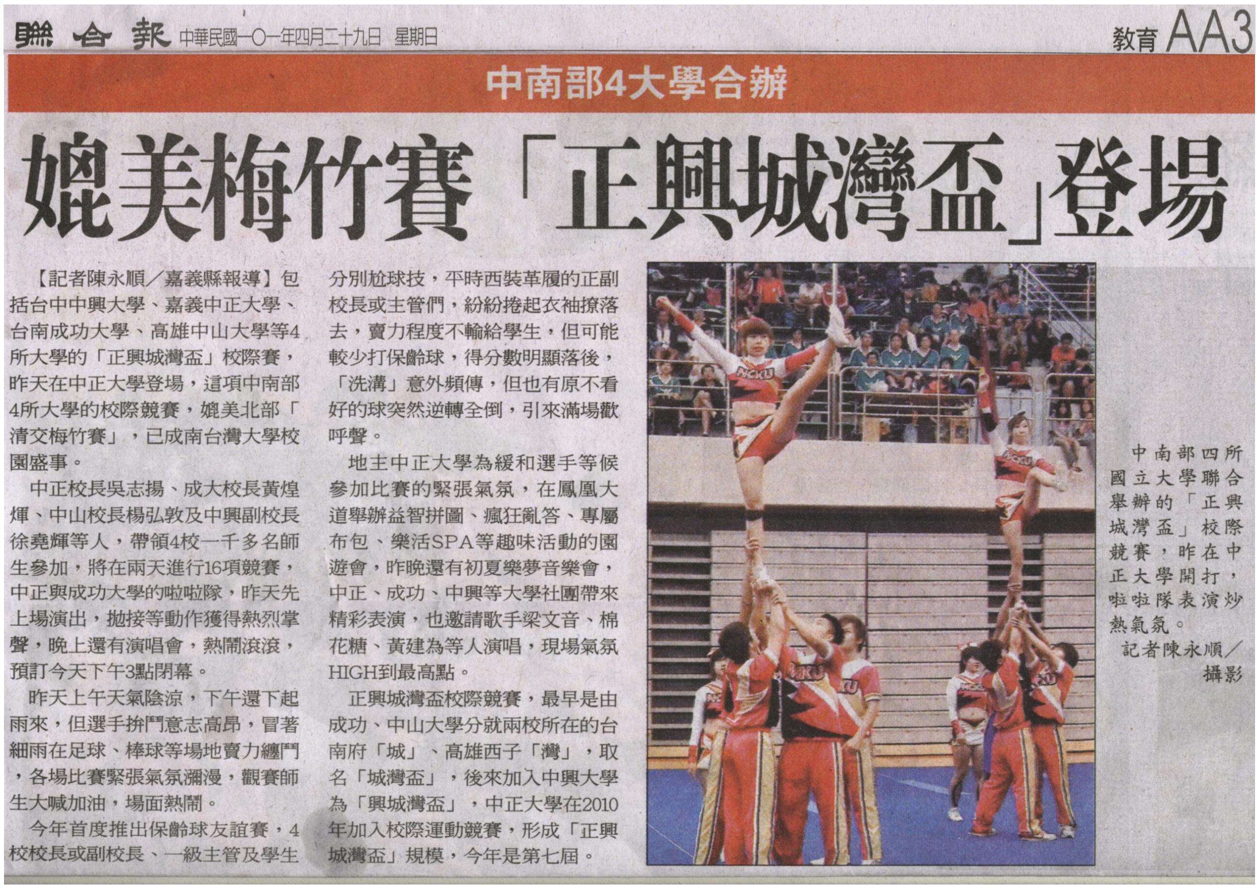 包括台中中興大學、嘉義中正大學、台南成功大學、高雄中山大學等4所大學的「正興城灣盃」校際賽,昨天在中正大學登場,這項中南部4所大學的校際競賽,媲美北部「清交梅竹賽」,已成南台灣大學校園盛事。