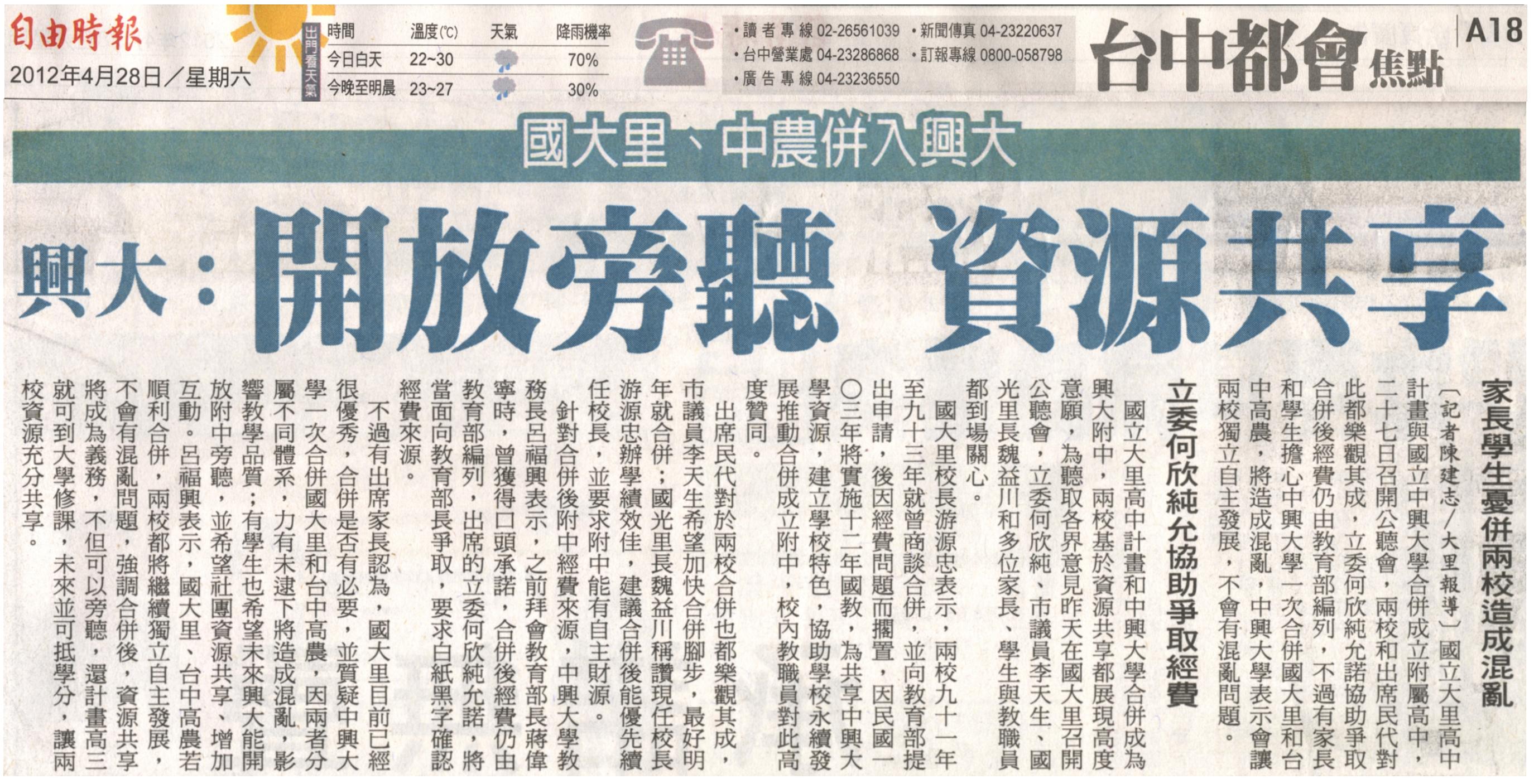 國立大里高中計畫與國立中興大學合併成立附屬高中,二十七日召開公聽會,兩校和出席民代對此都樂觀其成,立委何欣純允諾協助爭取合併後經費仍由教育部編列,不過有家長和學生擔心中興大學一次合併國大里和台中高農,將造成混亂,中興大學表示會讓兩校獨立自主發展,不會有混亂問題。