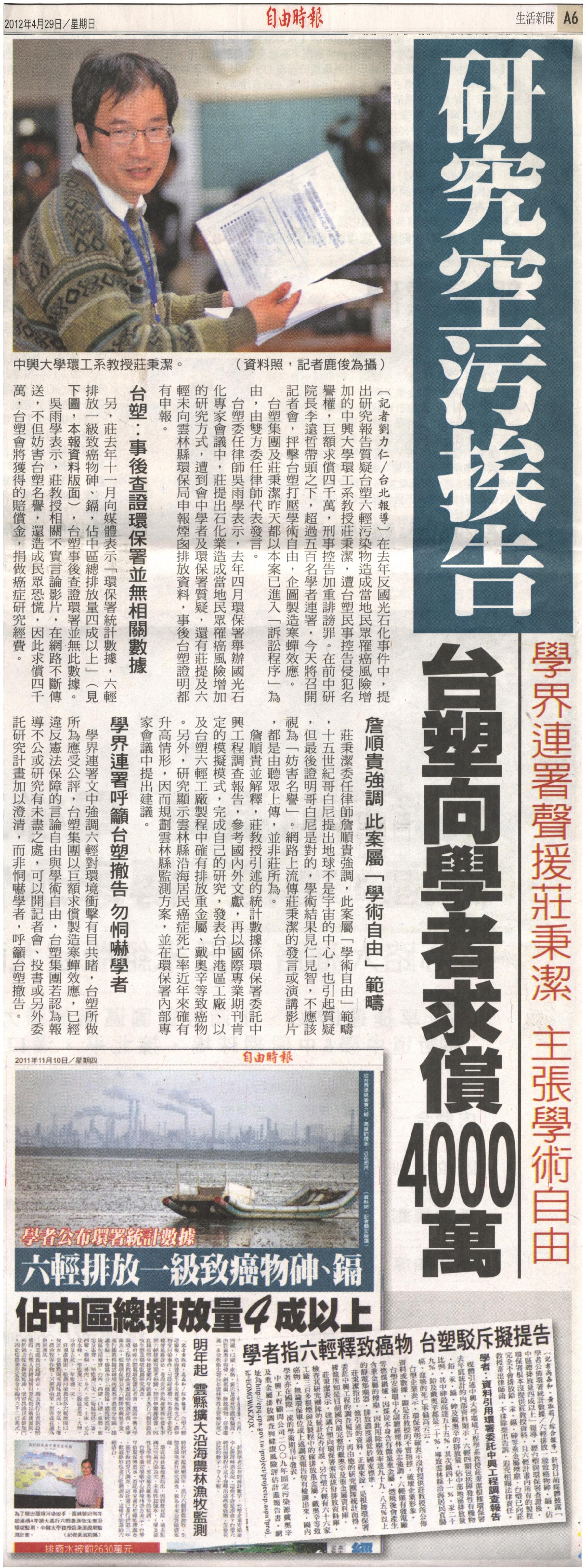 在去年反國光石化事件中,提出研究報告質疑台塑六輕污染物造成當地民眾罹癌風險增加的中興大學環工系教授莊秉潔,遭台塑民事控告侵犯名譽權,巨額求償四千萬,刑事控告加重誹謗罪。在前中研院長李遠哲帶頭之下,超過五百名學者連署,今天將召開記者會,抨擊台塑打壓學術自由,企圖製造寒蟬效應。