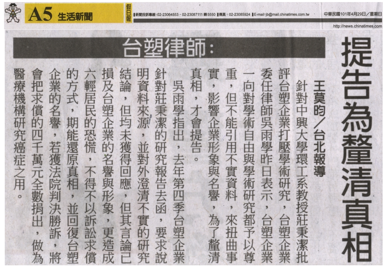 針對中興大學環工系教授莊秉潔批評台塑企業打壓學術研究,台塑企業委任律師吳雨學昨日表示,台塑企業一向對學術自由與學術研究都予以尊重,但不能引用不實資料,來扭曲事實,影響企業形象與名譽,為了釐清真相,才會提告。