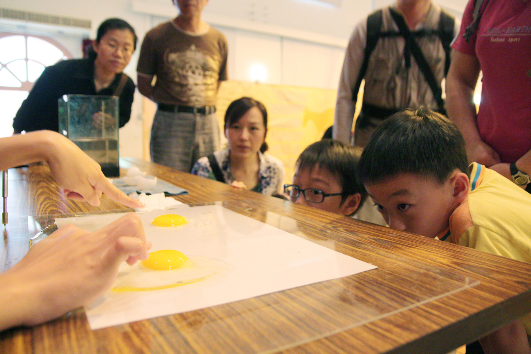 十多位興大動科系學生擔任解說員,請民眾拿起兩顆雞蛋搖一搖,學生解釋,晃動聲大代表蛋已放置一段時間氣室變大,較不新鮮。再來將蛋打在桌面上,觀察蛋白的濃稠度和蛋黃的圓凸程度,小朋友認真地將臉靠近桌面細心觀察,學生說,蛋白濃稠及蛋黃飽滿的蛋較新鮮。