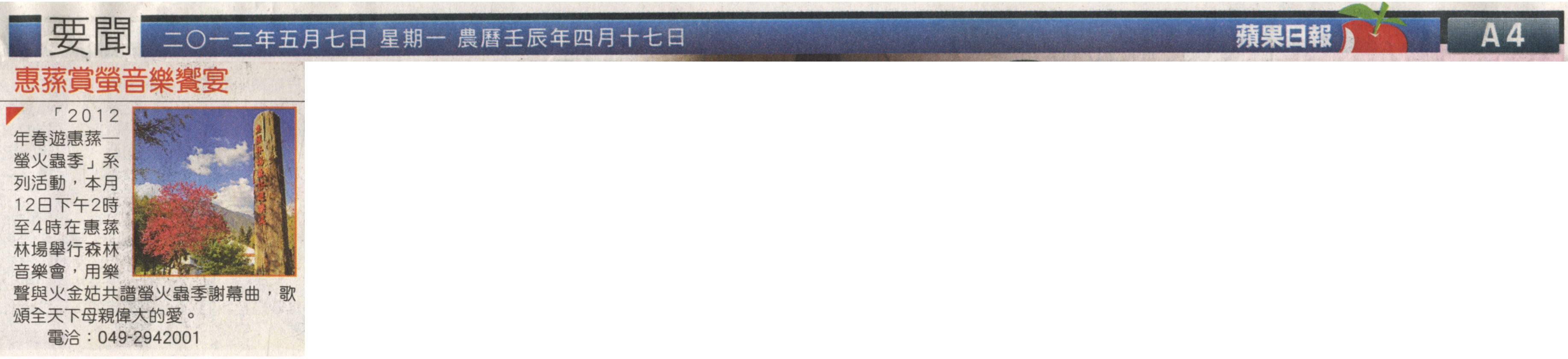 「2012年春遊惠蓀─螢火蟲季」系列活動,本月12日下午2時至4時在惠蓀林場舉行森林音樂會,用樂聲與火金姑共譜螢火蟲季謝幕曲,歌頌全天下母親偉大的愛。 電洽:049-2942001