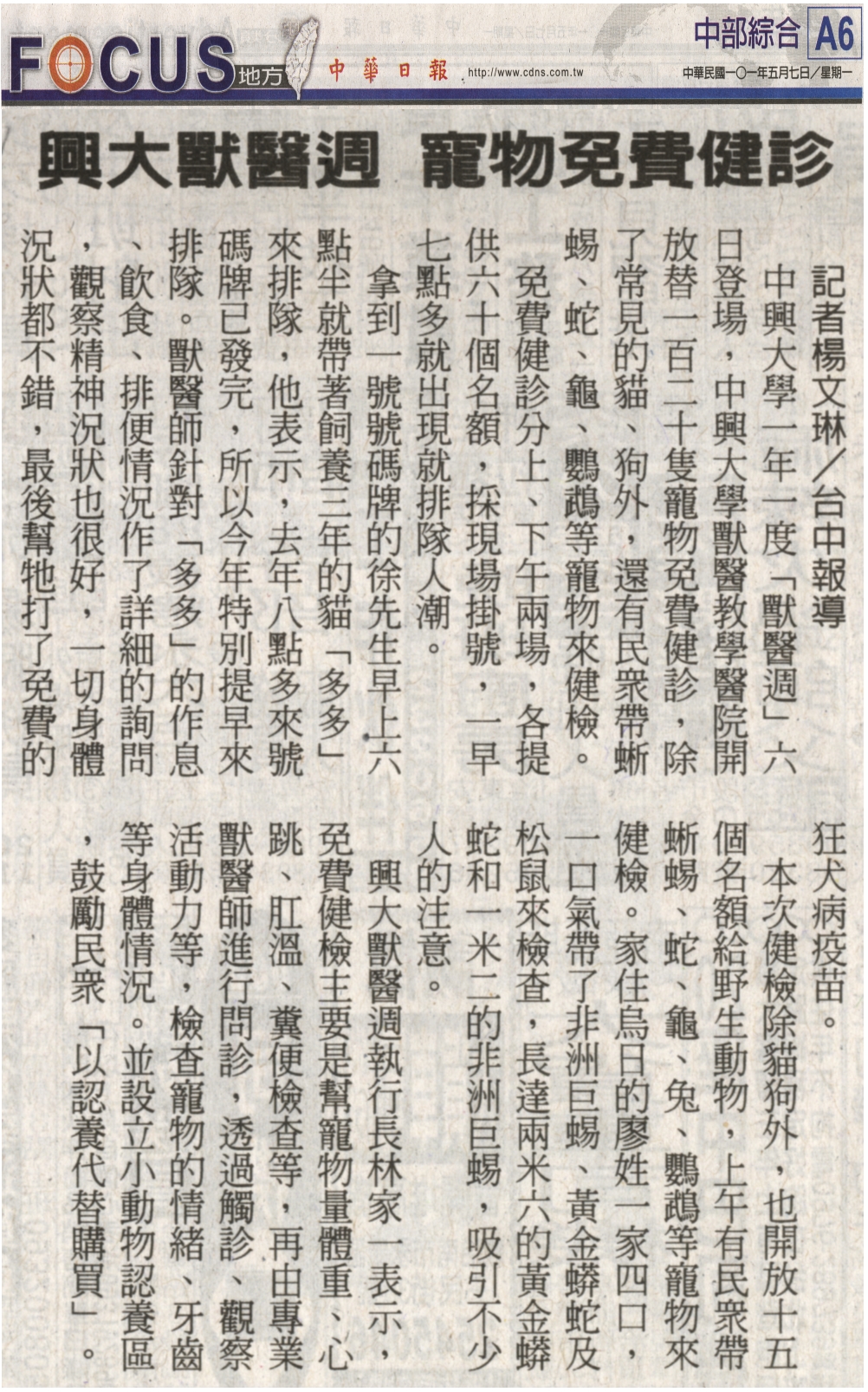 中興大學一年一度的「獸醫週」於五月六日登場,中興大學獸醫教學醫院特別開放替一百二十隻寵物免費健診,除了常見的貓、狗外,還有民眾帶蜥蜴、蛇、龜、鸚鵡等寵物來健檢。