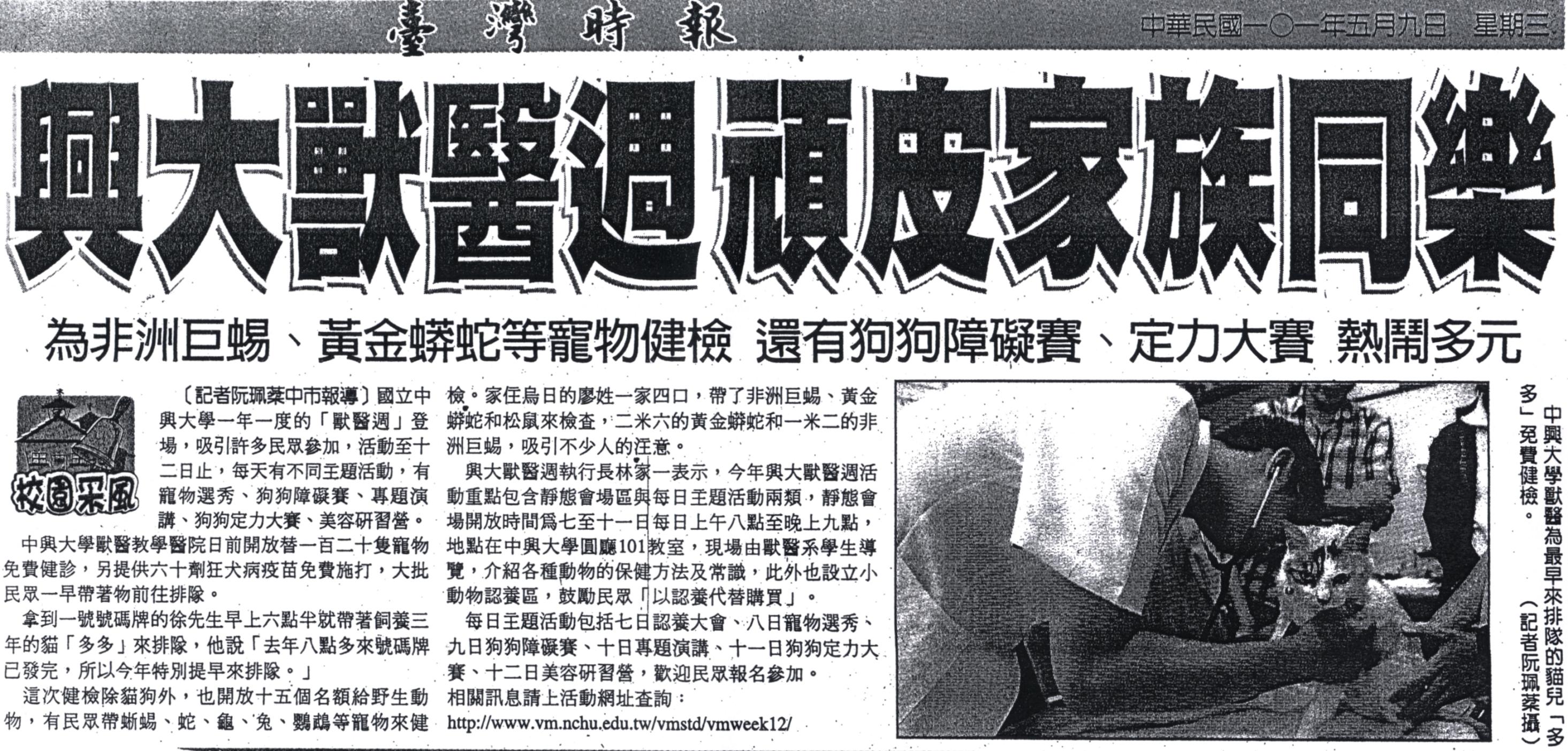 國立中興大學一年一度的「獸醫週」登場,吸引許多民眾參加,活動至十二日止,每天有不同主題活動,有寵物選秀、狗狗障礙賽、專題演講、狗狗定力大賽、美容研習營。