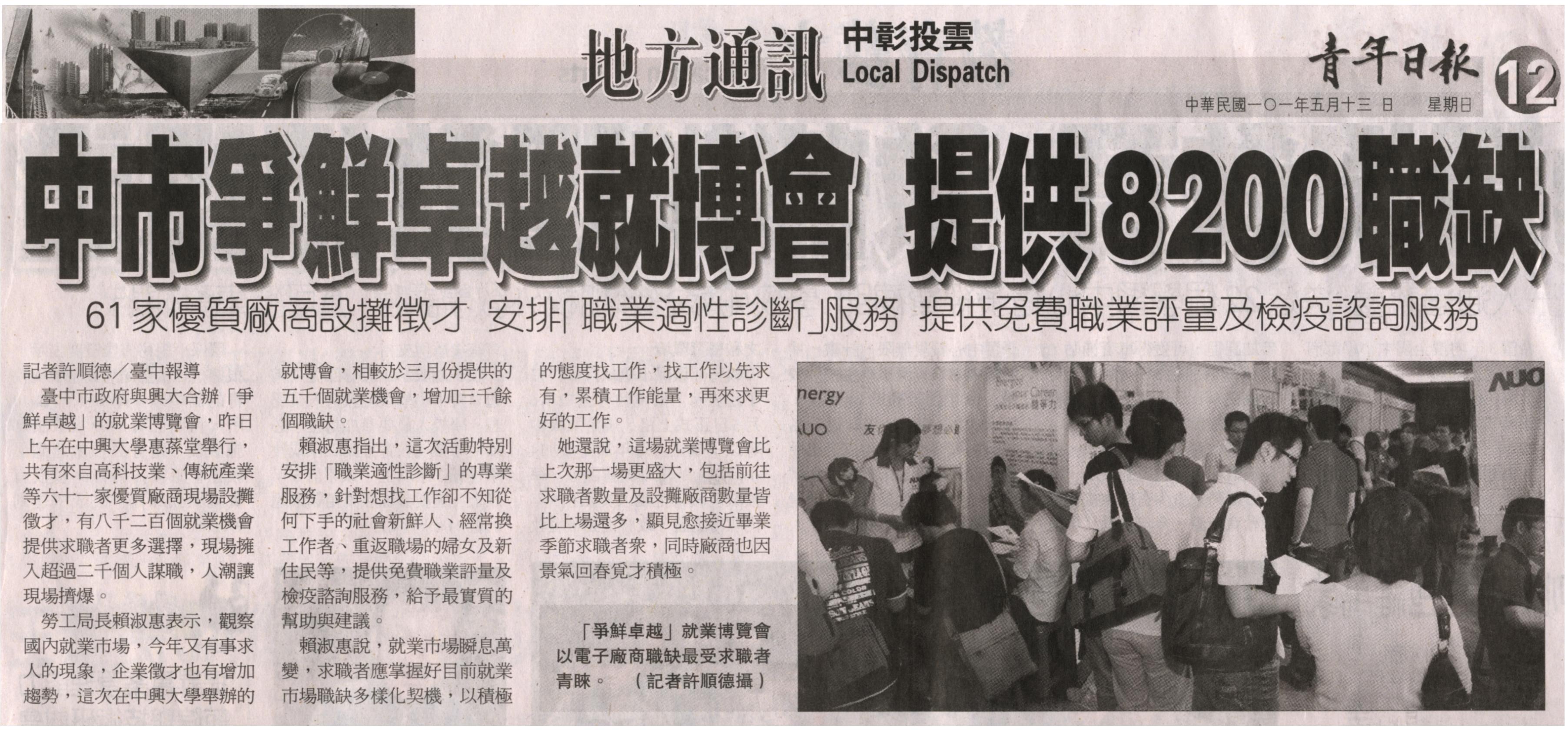 臺中市政府與興大合辦「爭鮮卓越」的就業博覽會,昨日上午在中興大學惠蓀堂舉行,共有來自高科技業、傳統產業等六十一家優質廠商現場設攤徵才,有八千二百個就業機會提供求職者更多選擇,現場擁入超過二千個人謀職,人潮讓現場擠爆。