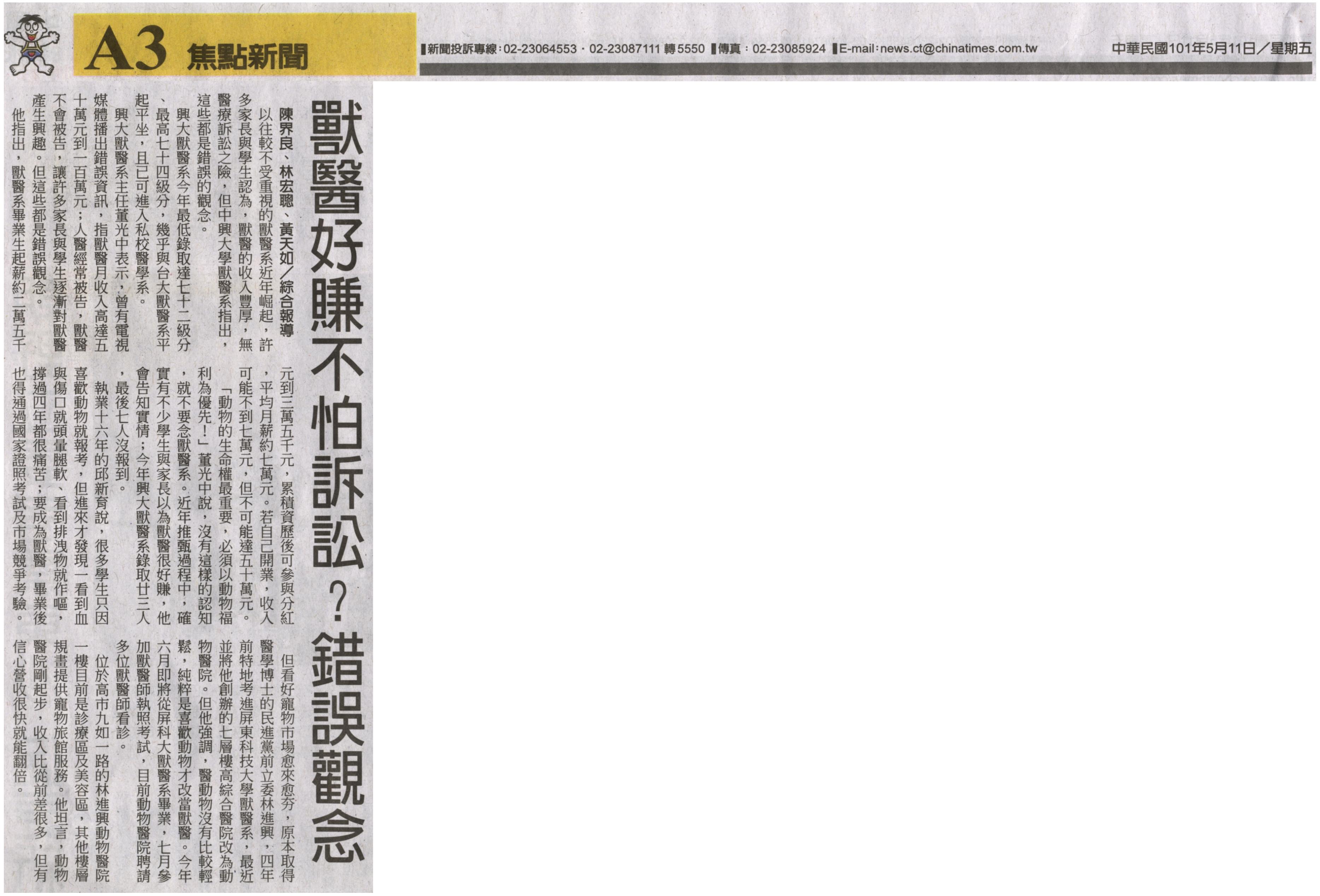 興大獸醫系主任董光中表示,曾有電視媒體播出錯誤資訊,指獸醫月收入高達五十萬元到一百萬元;人醫經常被告,獸醫不會被告,讓許多家長與學生逐漸對獸醫產生興趣。但這些都是錯誤觀念。