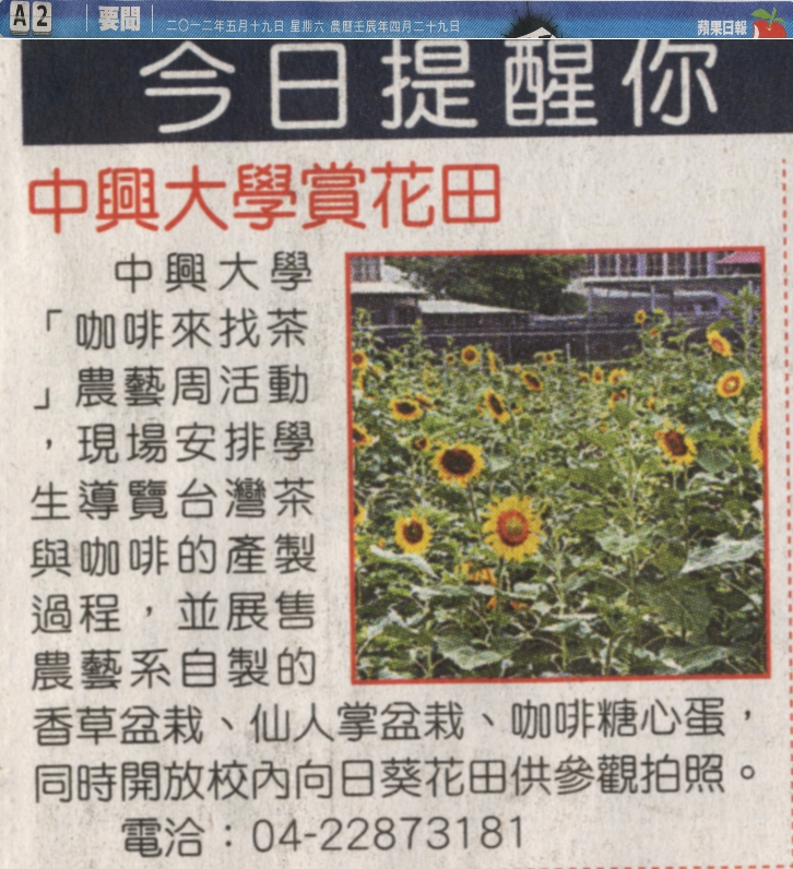 中興大學「咖啡來找茶 」農藝周活動 ,現場安排學生導覽台灣茶與咖啡的產製過程,並展售農藝系自製的香草盆栽、仙人掌盆栽、咖啡糖心蛋,同時開放校內向日葵花田供參觀拍照。