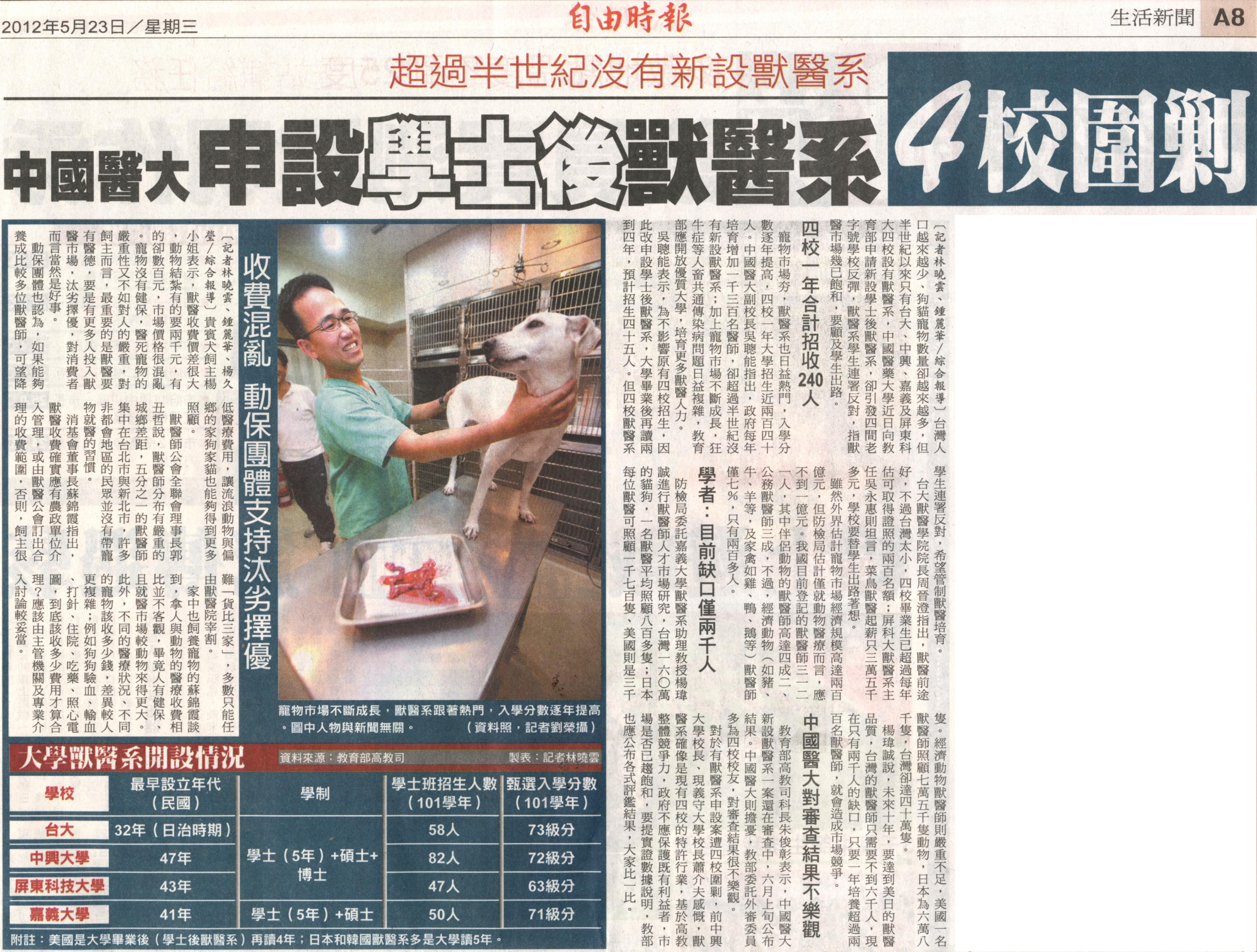 台灣人口越來越少、狗貓寵物數量卻越來越多,但半世紀以來只有台大、中興、嘉義及屏東科大四校設有獸醫系,中國醫藥大學近日向教育部申請新設學士後獸醫系,卻引發四間老字號學校反彈,獸醫系學生連署反對,指獸醫市場幾已飽和,要顧及學生出路。