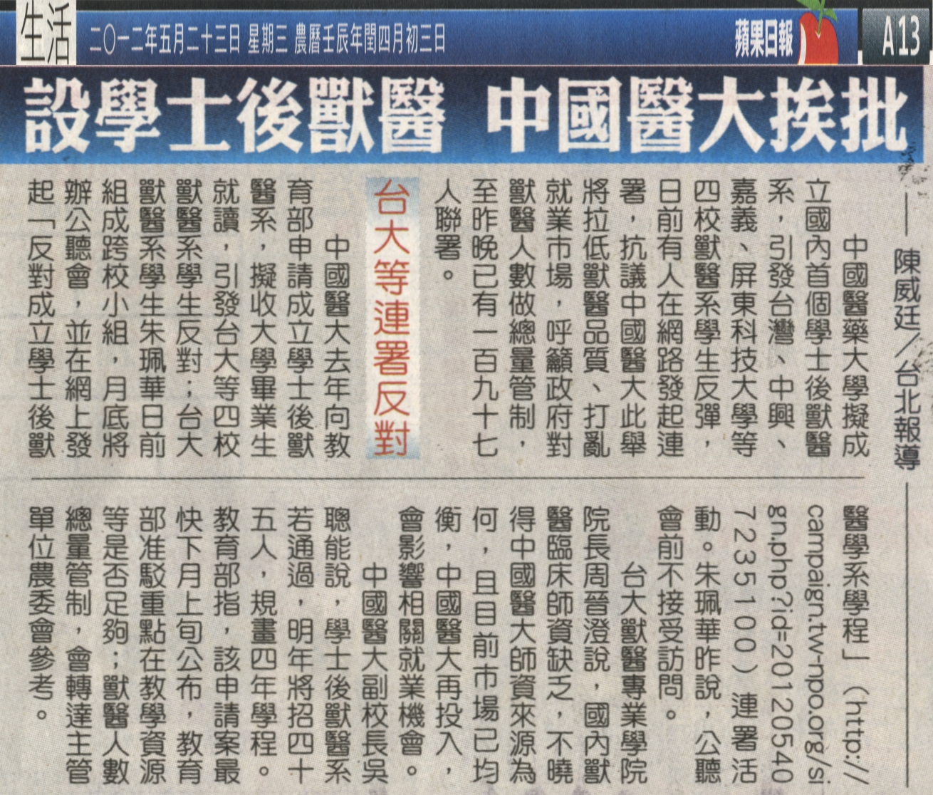 中國醫大去年向教育部申請成立學士後獸醫系,擬收大學畢業生就讀,引發台大等四校獸醫系學生反對;台大獸醫系學生朱珮華日前組成跨校小組,月底將辦公聽會,並在網上發起「反對成立學士後獸醫學系學程」(http://campaign.tw-npo.org/sign.php?id=201205407235100)連署活動。朱珮華昨說,公聽會前不接受訪問。