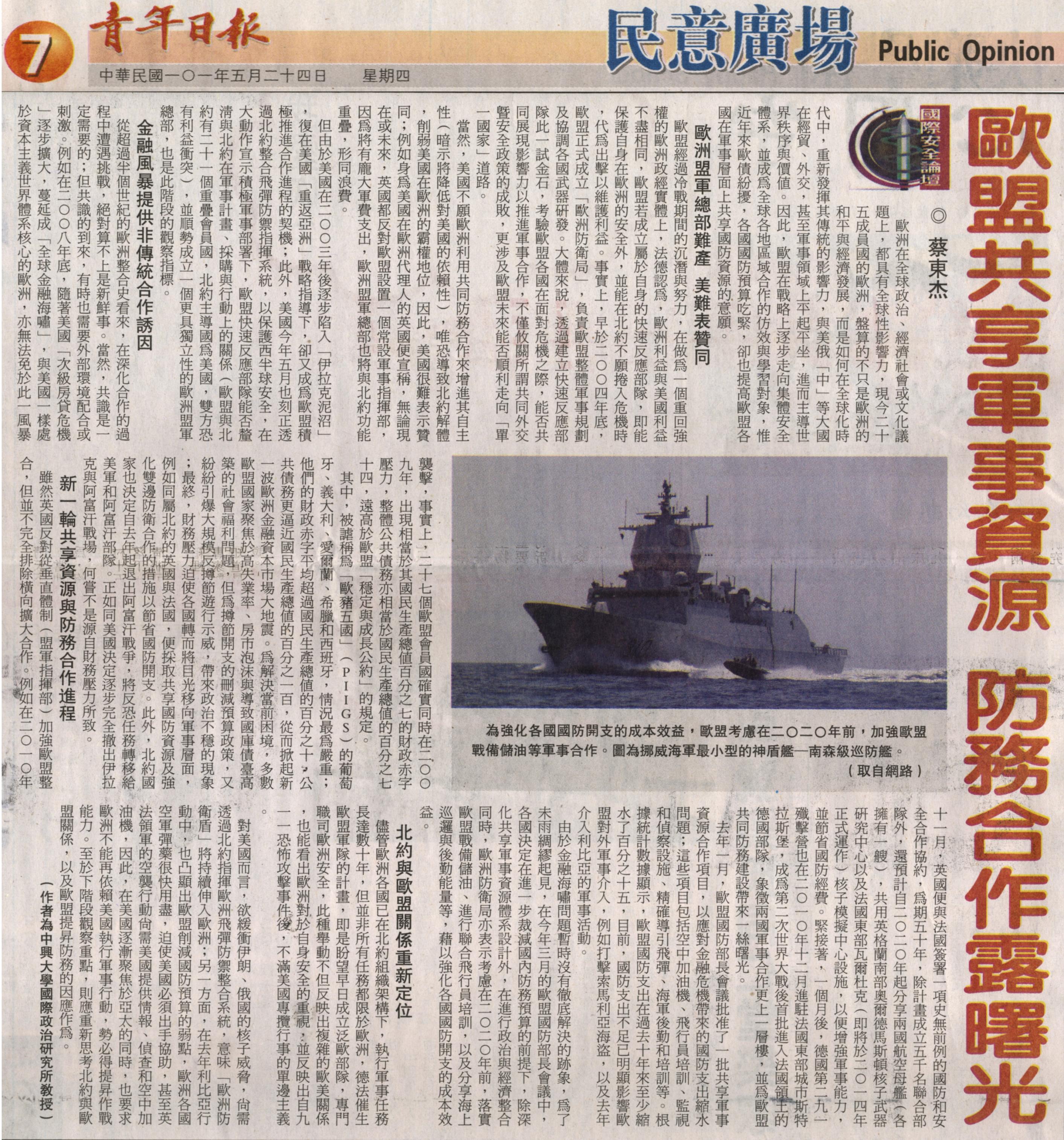 對美國而言,欲緩衝伊朗、俄國的核子威脅,尚需透過北約指揮歐洲飛彈防禦整合系統,意味「歐洲防衛盾」將持續伸入歐洲;另一方面,在去年利比亞行動中,也凸顯出歐盟削減國防預算的弱點,歐洲各國空軍彈藥很快用盡,迫使美國必須出手協助,甚至英法領軍的空襲行動尚需美國提供情報、偵查和空中加油機,因此,在美國逐漸聚焦於亞太的同時,也要求歐洲不能再依賴美國執行軍事行動,勢必得提昇作戰能力。至於下階段觀察重點,則應重新思考北約與歐盟關係,以及歐盟提昇防務的因應作為。