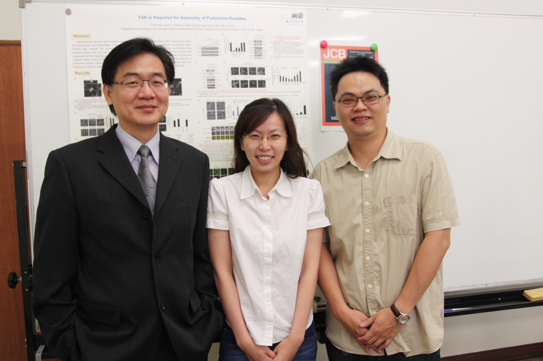 【圖/媒體公關組、文/生科院陳鴻震】癌轉移是癌症治療上最為棘手的問題,而癌轉移與癌細胞的組織侵犯能力相關,若能有效抑制癌細胞的組織侵犯能力,將可大大降低癌轉移的發生。國立中興大學生命科學院院長陳鴻震所領導的研究團隊,發現FAK(一種酪胺酸磷酸化激酶)是調控癌細胞組織侵犯能力的關鍵基因,這項研究成果已於2011年10月3日刊登在國際知名期刊「細胞生物學期刊」(Journal of Cell Biology)。