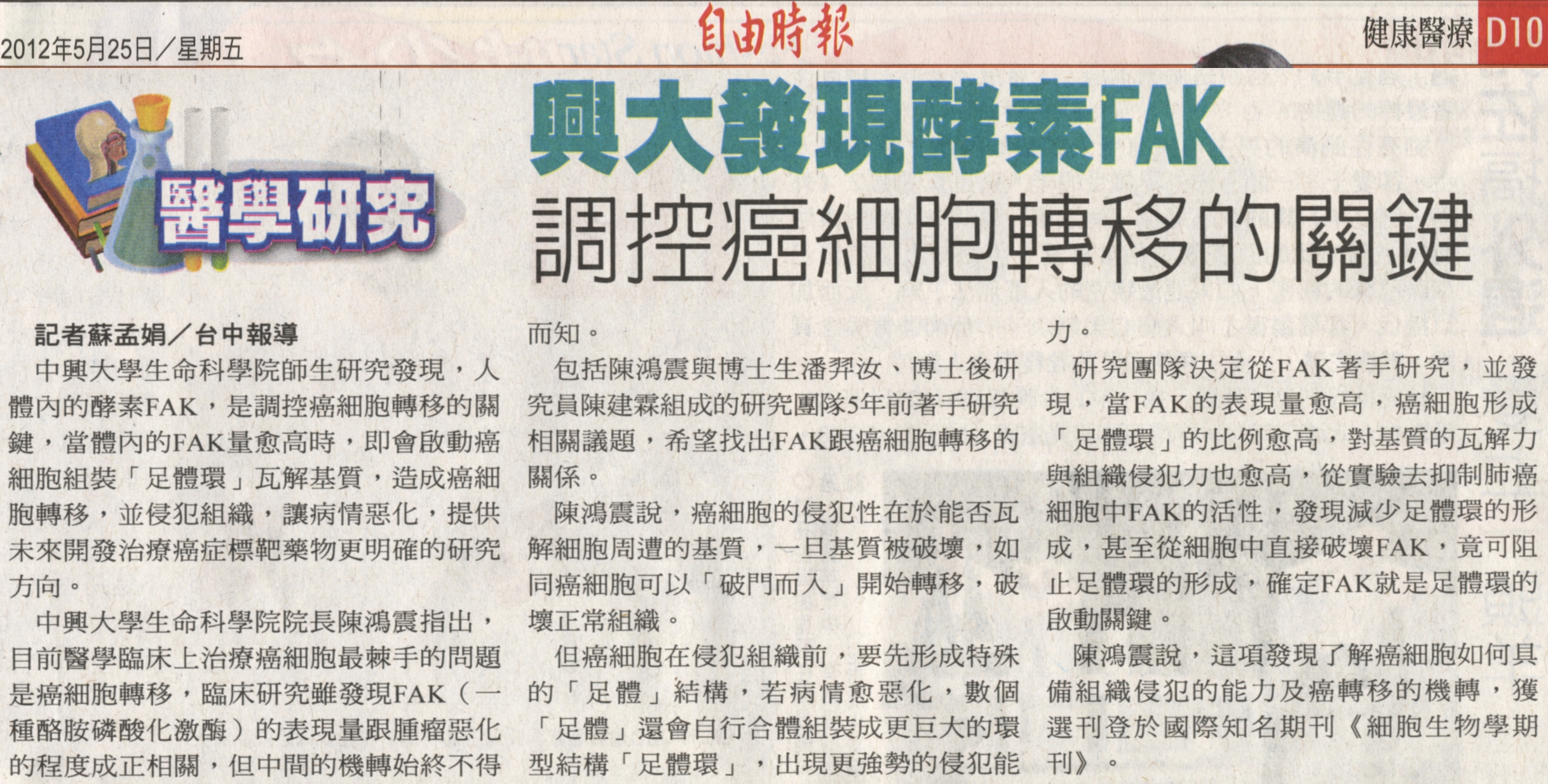 • 【媒體報導】〈醫學研究〉興大發現酵素FAK 調控癌細胞轉移的關鍵