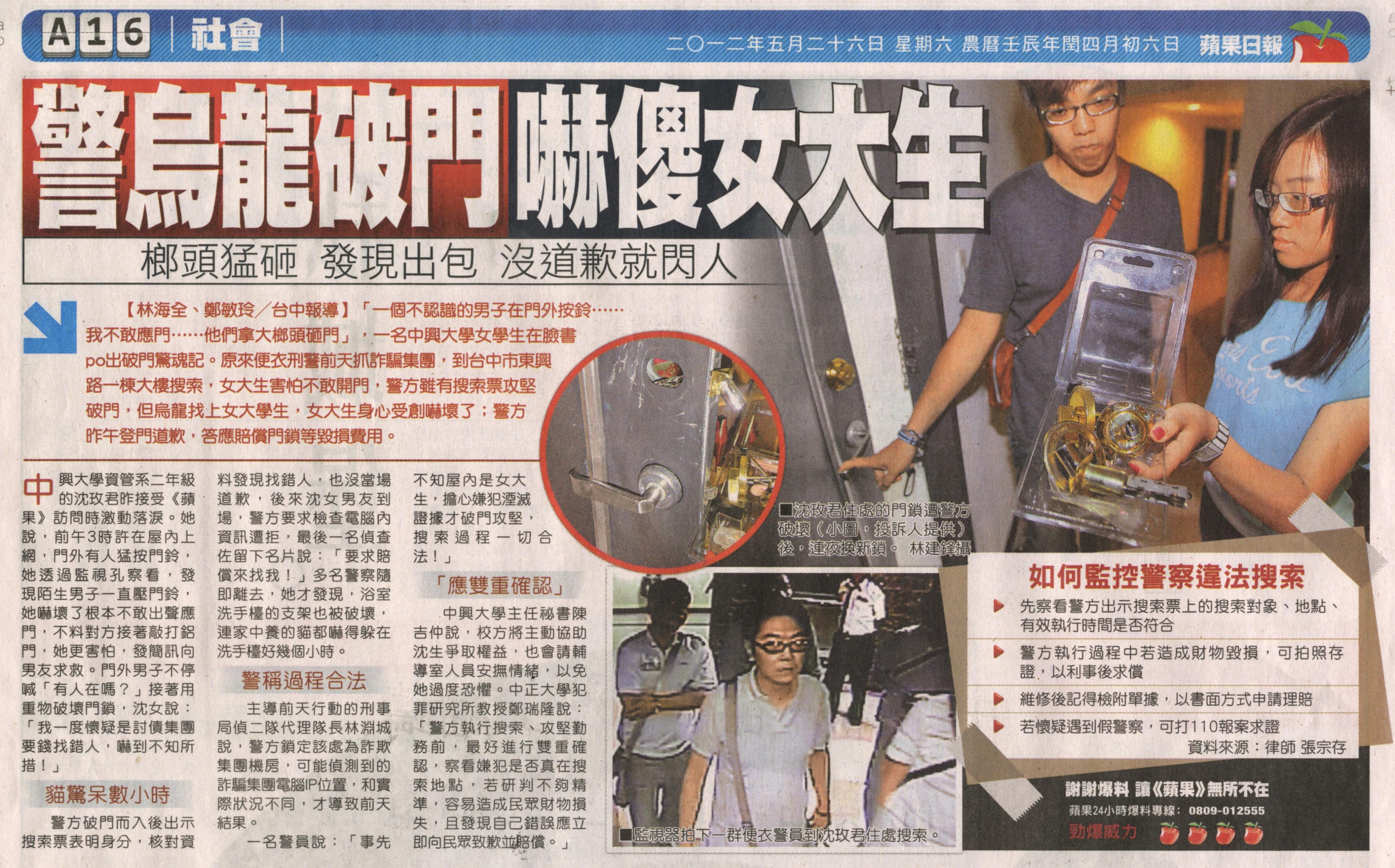 「一個不認識的男子在門外按鈴……我不敢應門……他們拿大榔頭砸門」,一名中興大學女學生在臉書po出破門驚魂記。原來便衣刑警前天抓詐騙集團,到台中市東興路一棟大樓搜索,女大生害怕不敢開門,警方雖有搜索票攻堅破門,但烏龍找上女大學生,女大生身心受創嚇壞了;警方昨午登門道歉,答應賠償門鎖等毀損費用。