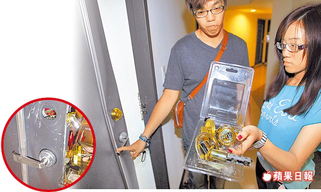 沈玫君住處的門鎖遭警方破壞(小圖,投訴人提供)後,連夜換新鎖。 |