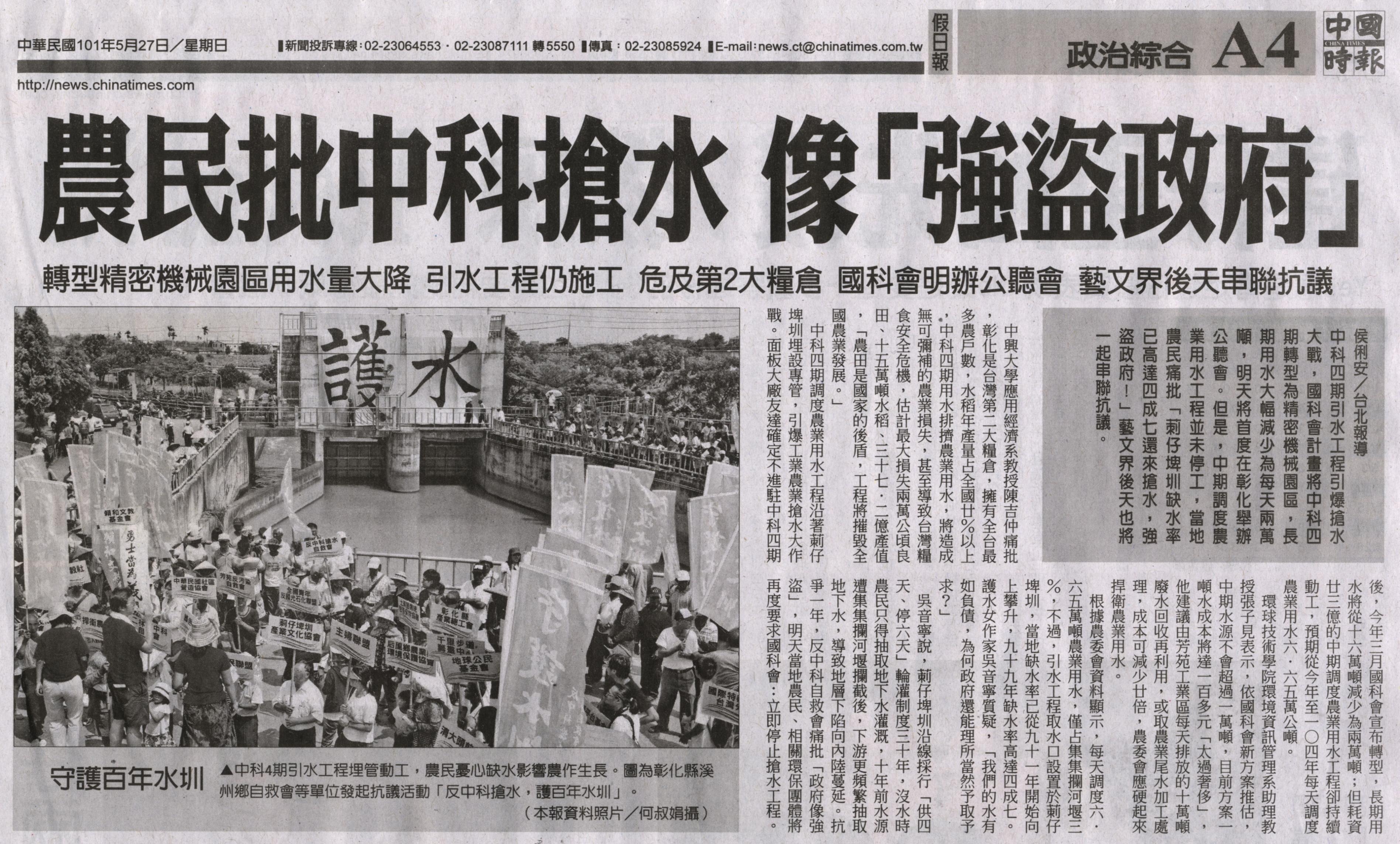轉型精密機械園區用水量大降 引水工程仍施工 危及第2大糧倉 國科會明辦公聽會 藝文界後天串聯抗議