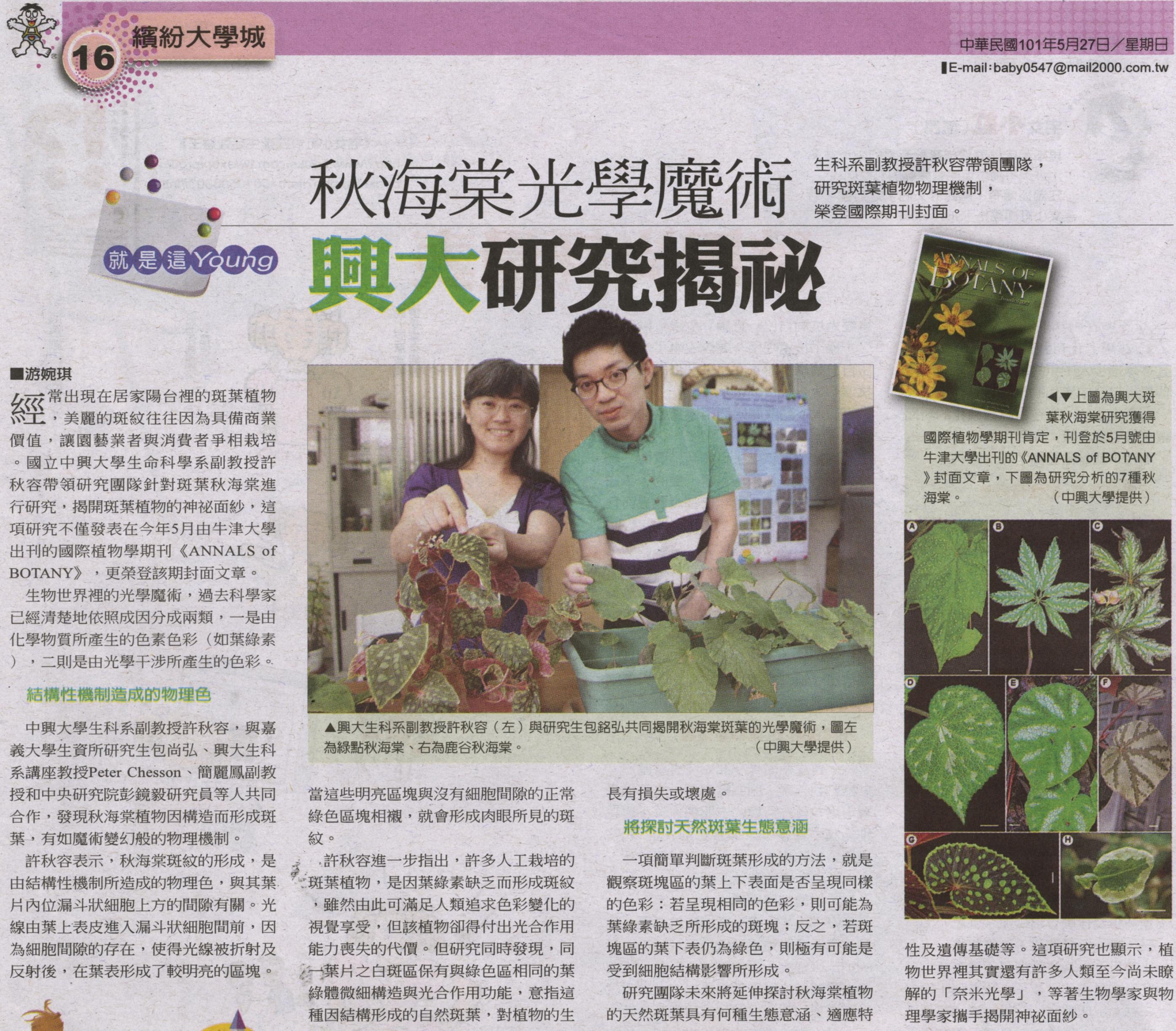 中興大學生科系副教授許秋容,與嘉義大學生資所研究生包尚弘、 興大生科系講座教授Peter Chesson、簡麗鳳副教授和中央研究院彭鏡毅研究員等人共同合作,發現秋海棠植物因構造而形成斑葉,有如魔術變幻般的物理機制。