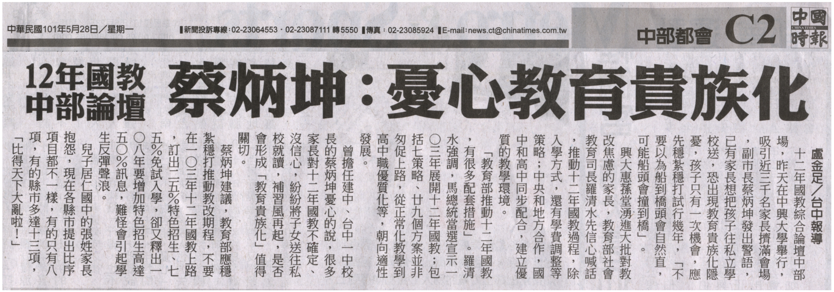 曾擔任建中、台中一中校長的蔡炳坤憂心的說,很多家長對十二年國教不確定、沒信心,紛紛將子女送往私校就讀,補習風再起,是否會形成「教育貴族化」值得關切。