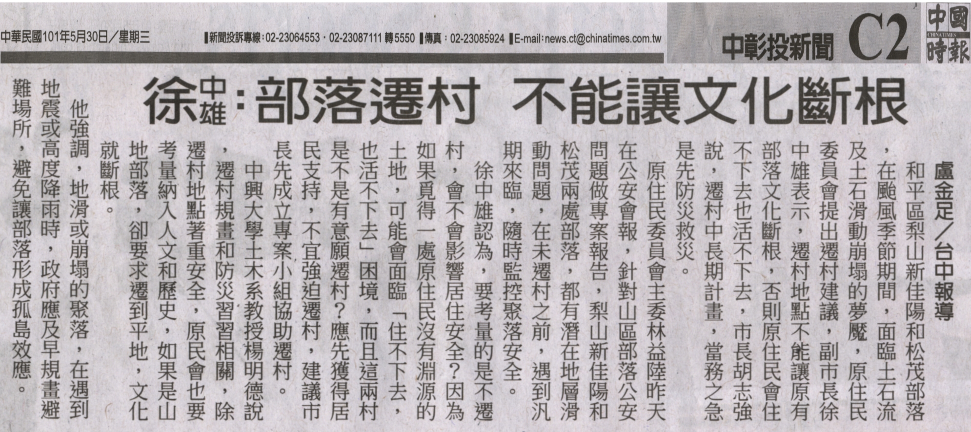 徐中雄認為,要考量的是不遷村,會不會影響居住安全?因為如果覓得一處原住民沒有淵源的土地,可能會面臨「住不下去,也活不下去」困境,而且這兩村是不是有意願遷村?應先獲得居民支持,不宜強迫遷村,建議市長先成立專案小組協助遷村。