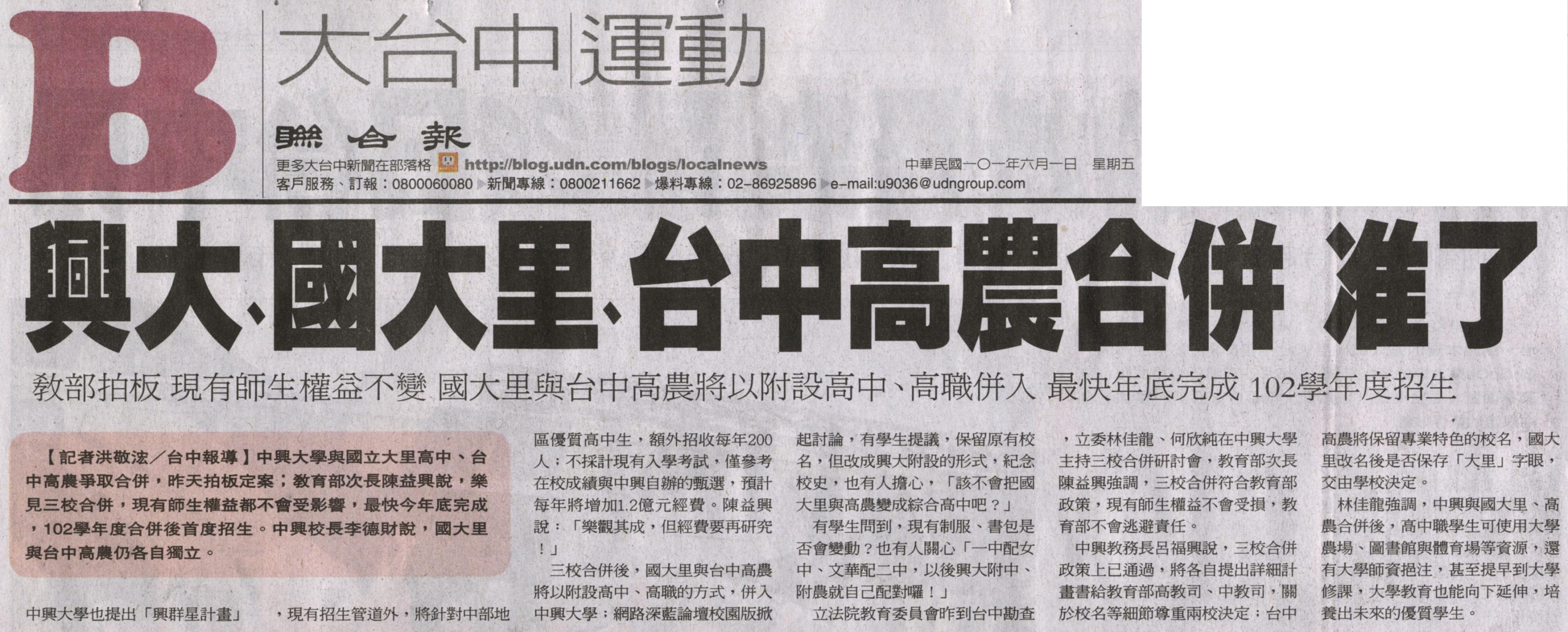 中興大學與國立大里高中、台中高農爭取合併,昨天拍板定案;教育部次長陳益興說,樂見三校合併,現有師生權益都不會受影響,最快今年底完成,102學年度合併後首度招生。中興校長李德財說,國大里與台中高農仍各自獨立。