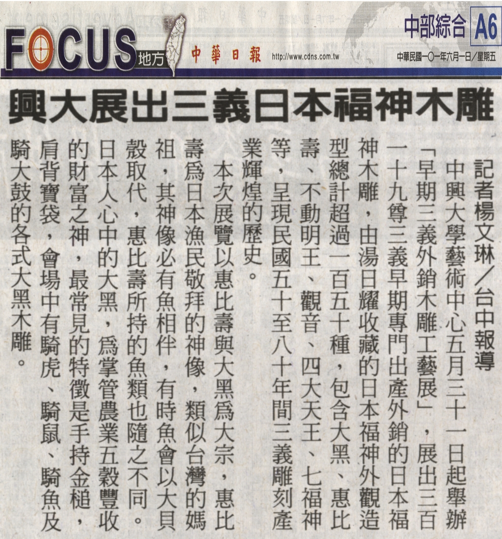 中興大學藝術中心五月三十一日起舉辦「早期三義外銷木雕工藝展」,展出三百一十九尊三義早期專門出產外銷的日本福神木雕,由湯日耀收藏的日本福神外觀造型總計超過一百五十種,包含大黑、惠比壽、不動明王、觀音、四大天王、七福神等,呈現民國五十至八十年間三義雕刻產業輝煌的歷史。