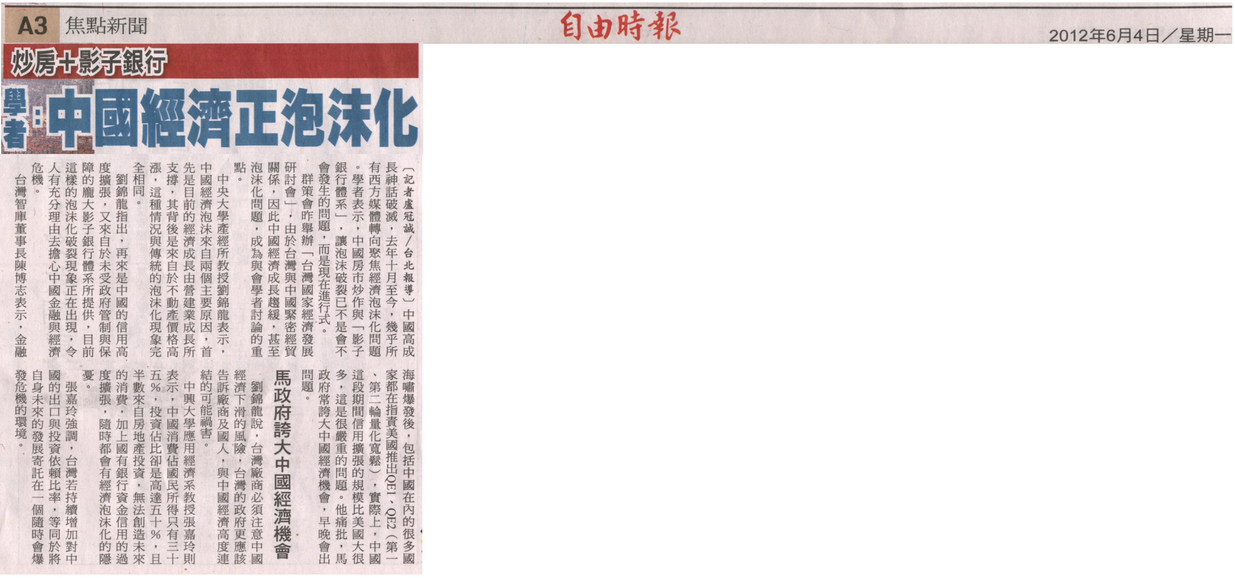台灣智庫董事長陳博志表示,金融海嘯爆發後,包括中國在內的很多國家都在指責美國推出QE1、QE2(第一、第二輪量化寬鬆),實際上,中國這段期間信用擴張的規模比美國大很多,這是很嚴重的問題。他痛批,馬政府常誇大中國經濟機會,早晚會出問題。
