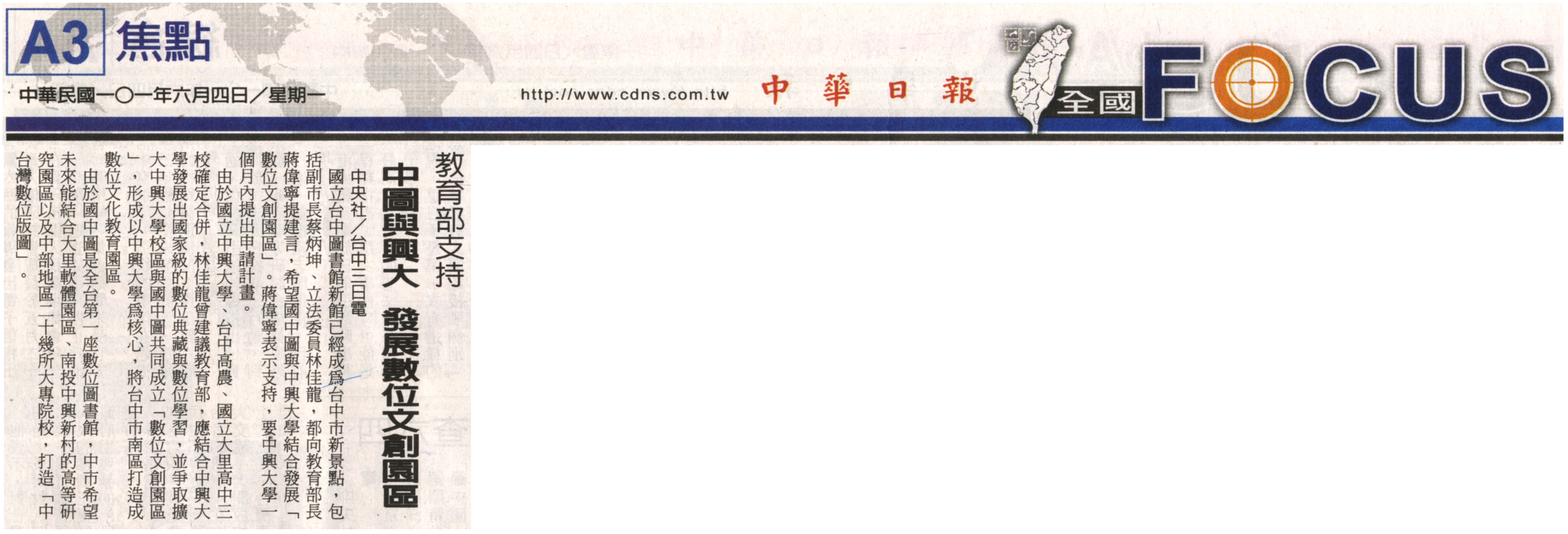 國立台中圖書館新館已經成為台中市新景點,包括副市長蔡炳坤、立法委員林佳龍,都向教育部長蔣偉寧提建言,希望國中圖與中興大學結合發展「數位文創園區」。蔣偉寧表示支持,要中興大學一個月內提出申請計畫。