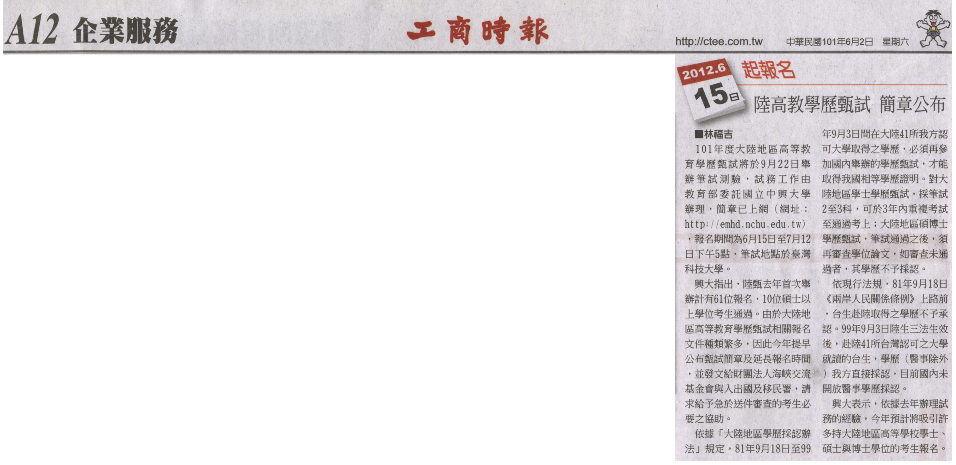 101年度大陸地區高等教育學歷甄試將於9月22日舉辦筆試測驗,試務工作由教育部委託國立中興大學辦理,簡章已上網(網址:http: //emhd.nchu.edu.tw),報名期間為6月15日至7月12日下午5點,筆試地點於臺灣科技大學。