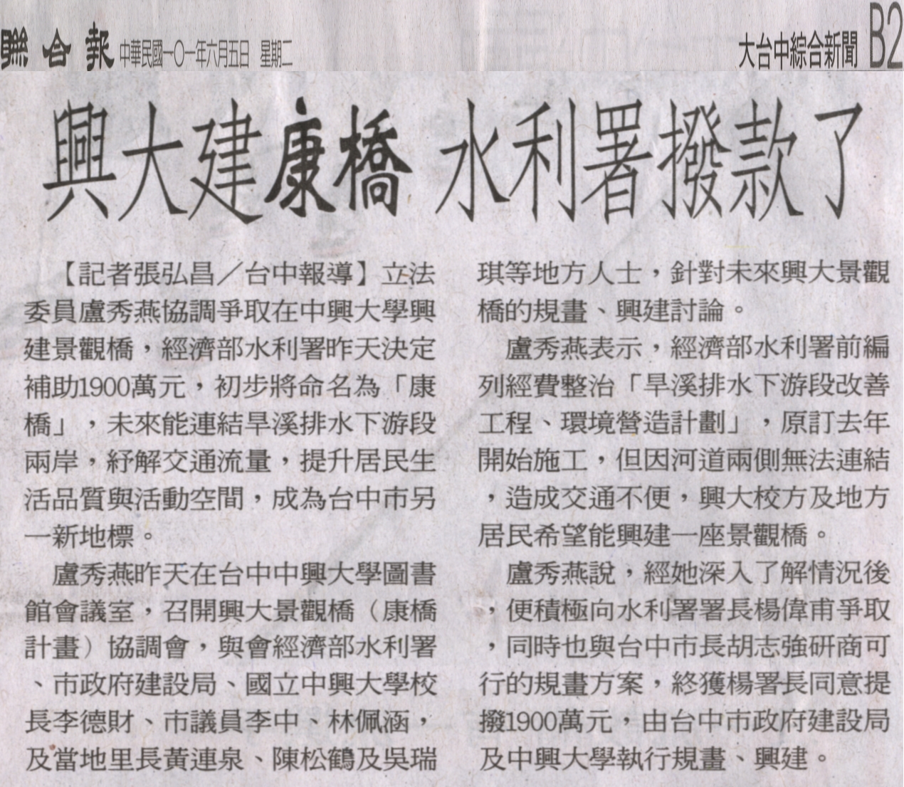 立法委員盧秀燕協調爭取在中興大學興建景觀橋,經濟部水利署昨天決定補助1900萬元,初步將命名為「康橋」,未來能連結旱溪排水下游段兩岸,紓解交通流量,提升居民生活品質與活動空間,成為台中市另一新地標。