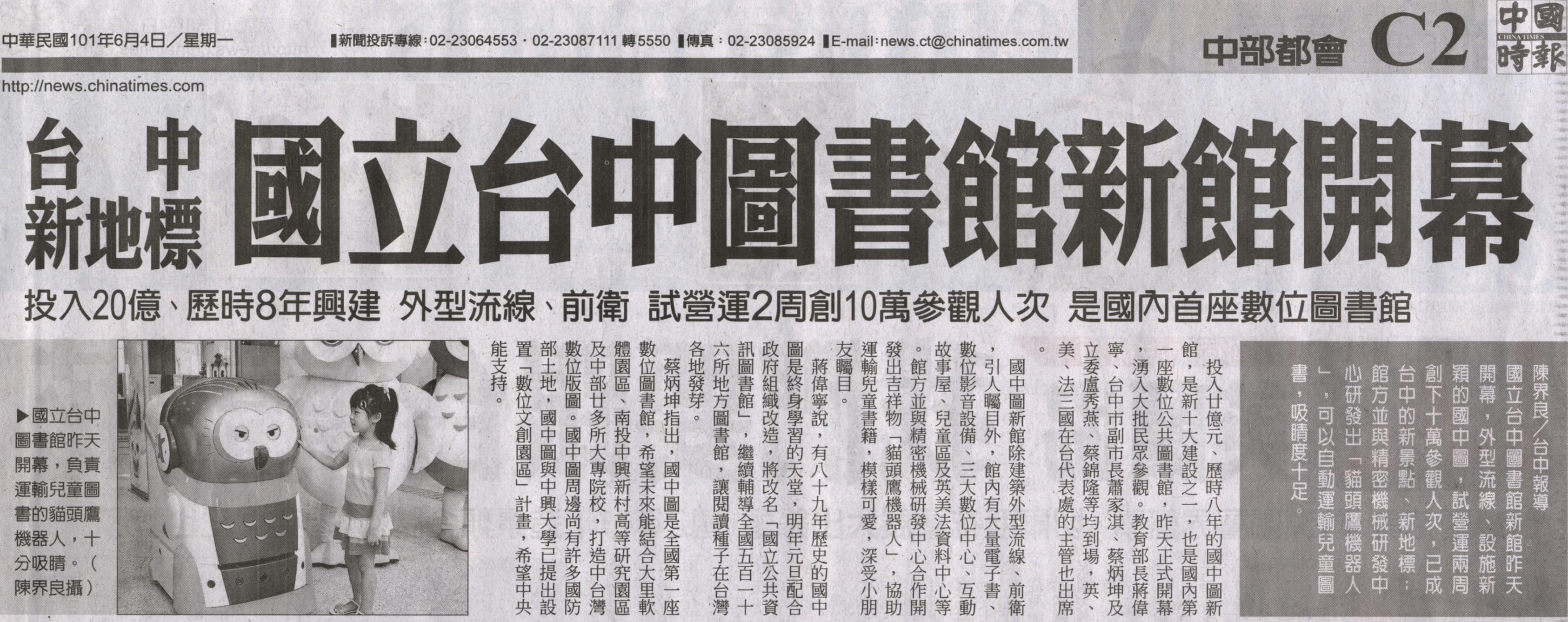 國立台中圖書館新館昨天開幕,外型流線、設施新穎的國中圖,試營運兩周創下十萬參觀人次,已成台中的新景點、新地標;館方並與精密機械研發中心研發出「貓頭鷹機器人」,可以自動運輸兒童圖書,吸睛度十足。