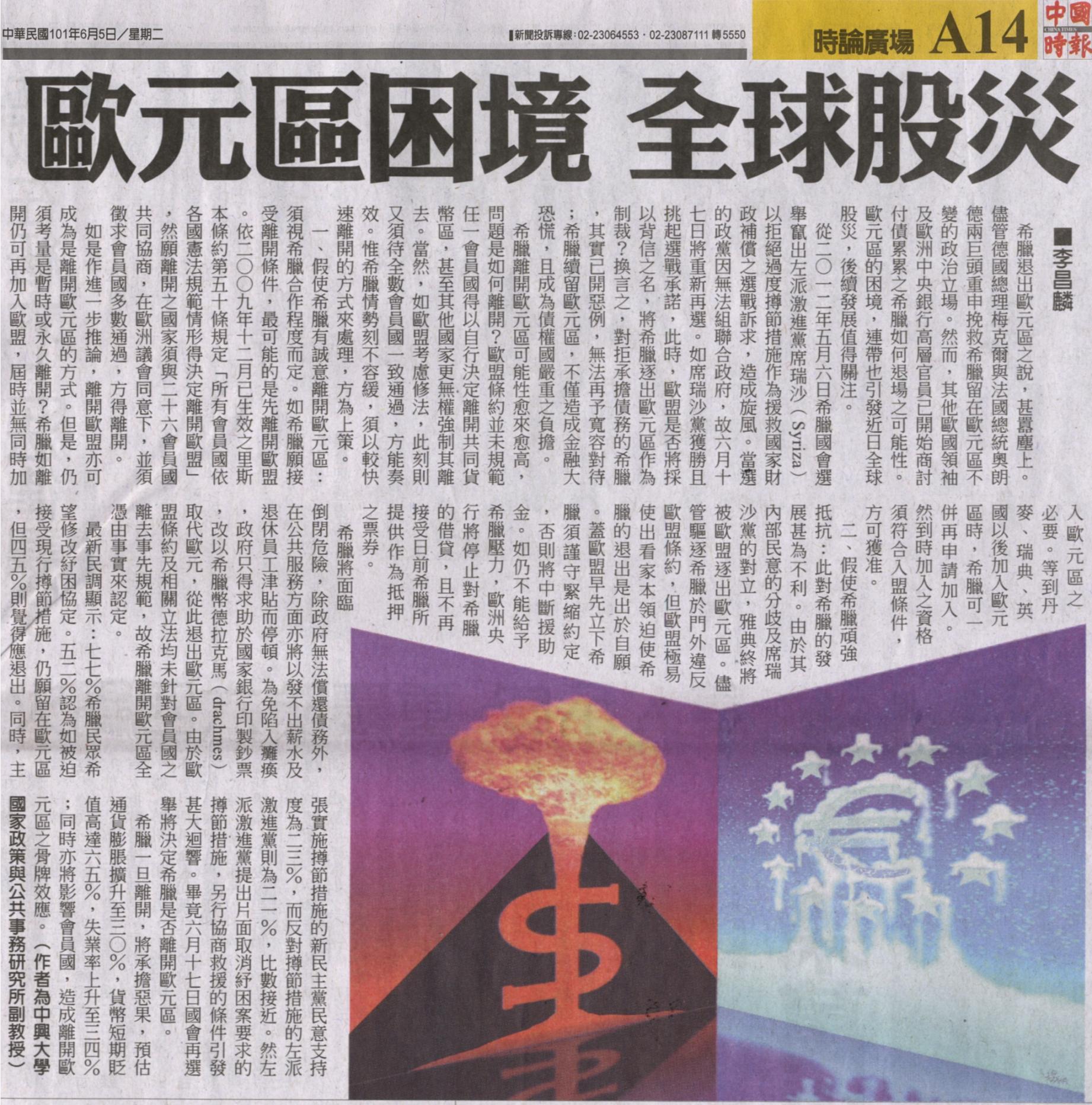 希臘退出歐元區之說,甚囂塵上。儘管德國總理梅克爾與法國總統奧朗德兩巨頭重申挽救希臘留在歐元區不變的政治立場。然而,其他歐國領袖及歐洲中央銀行高層官員已開始商討付債累累之希臘如何退場之可能性。歐元區的困境,連帶也引發近日全球股災,後續發展值得關注。
