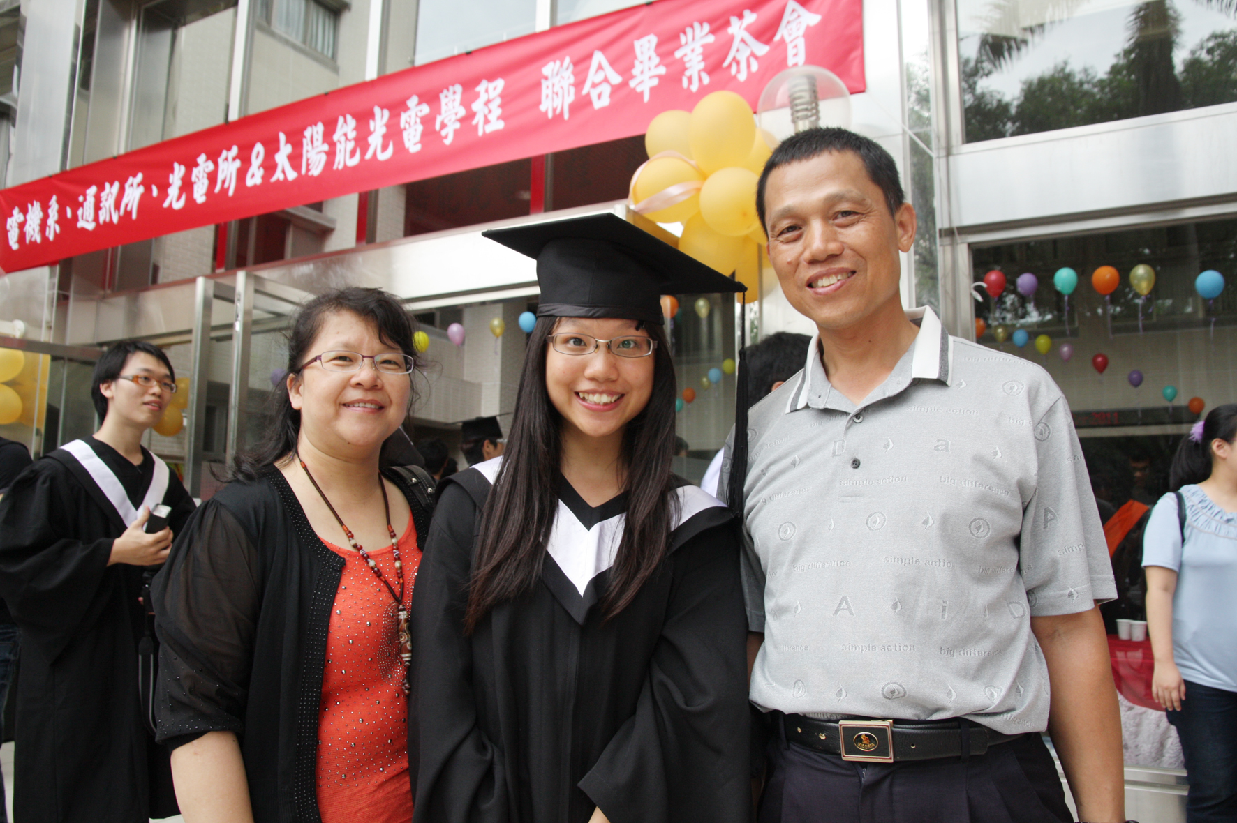 ![]() 長期志願照顧特教生的中興大學畢業生曾昱嫥(中)9日畢業與父母合影 |