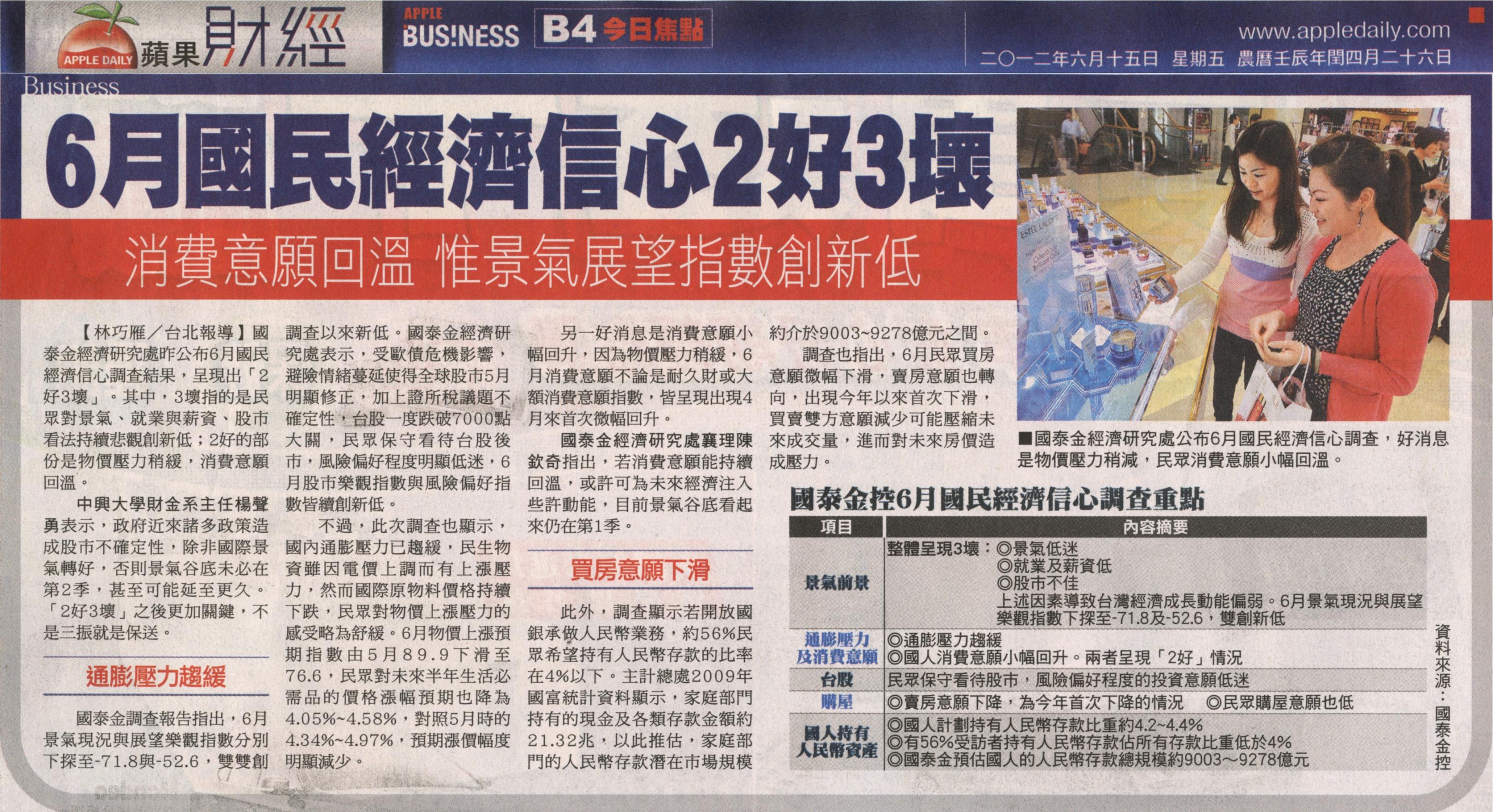 國泰金經濟研究處昨公布6月國民經濟信心調查結果,呈現出「2好3壞」。其中,3壞指的是民眾對景氣、就業與薪資、股市看法持續悲觀創新低;2好的部份是物價壓力稍緩,消費意願回溫。