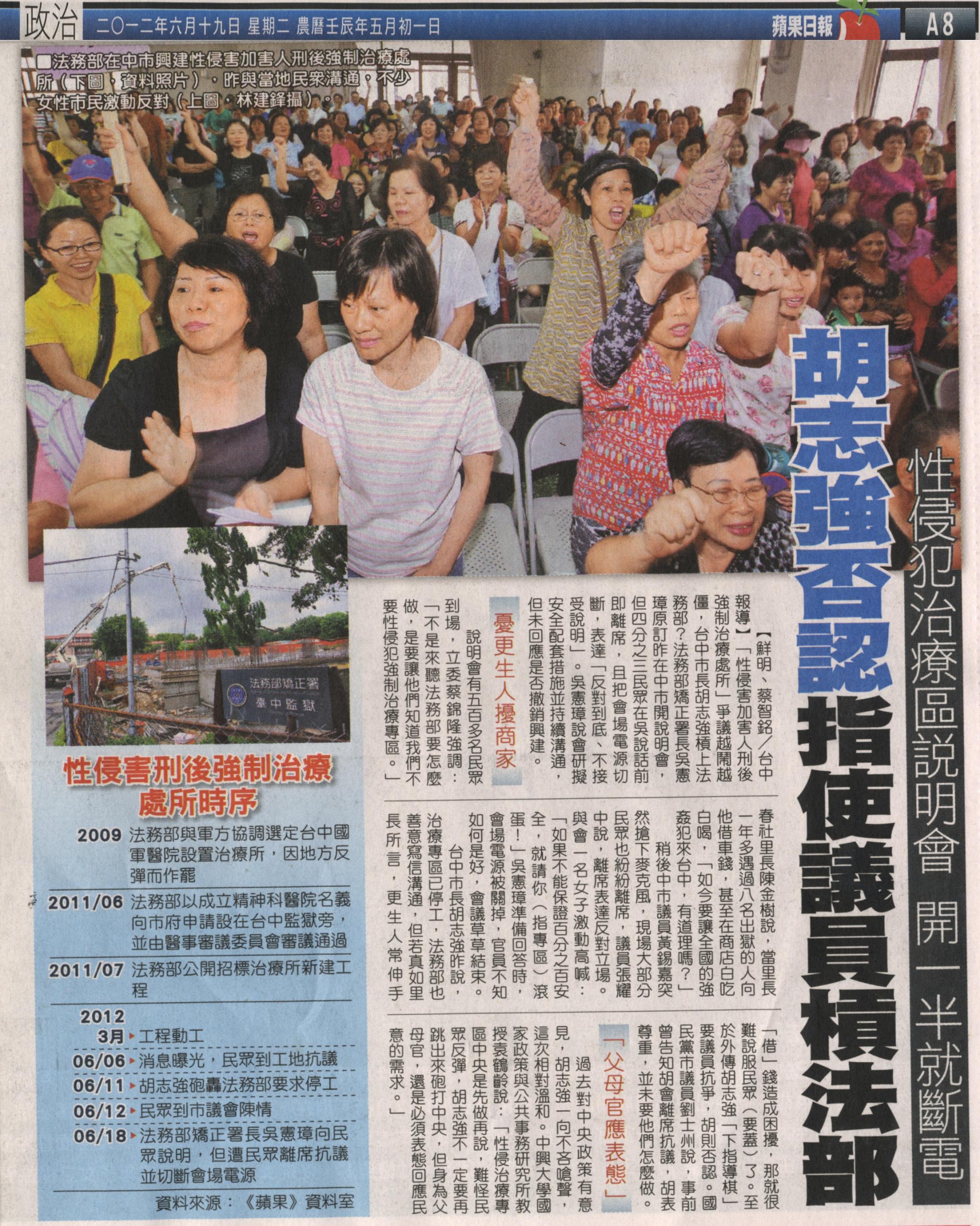 「性侵害加害人刑後強制治療處所」爭議越鬧越僵,台中市長胡志強槓上法務部?法務部矯正署長吳憲璋原訂昨在中市開說明會,但四分之三民眾在吳說話前即離席,且把會場電源切斷,表達「反對到底、不接受說明」。吳憲璋說會研擬安全配套措施並持續溝通,但未回應是否撤銷興建。