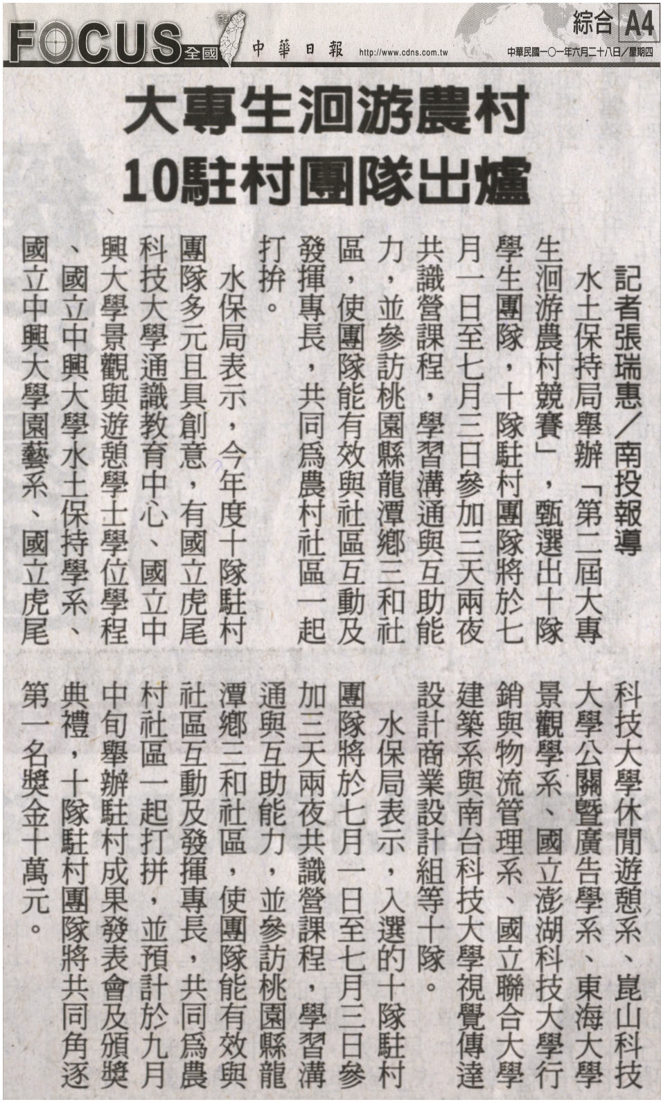 水土保持局舉辦「第二屆大專生洄游農村競賽」,甄選出十隊學生團隊,十隊駐村團隊將於七月一日至七月三日參加三天兩夜共識營課程,學習溝通與互助能力,並參訪桃園縣龍潭鄉三和社區,使團隊能有效與社區互動及發揮專長,共同為農村社區一起打拚。